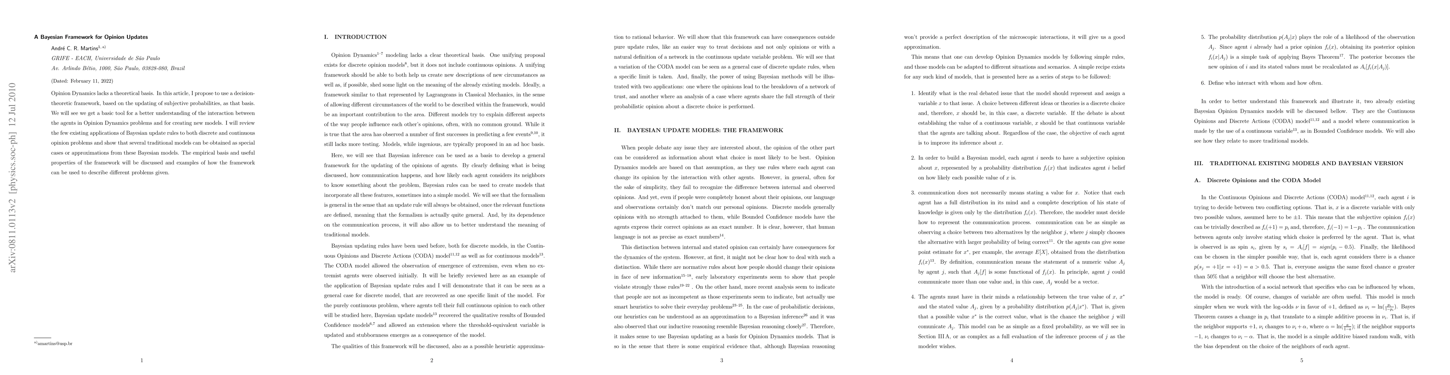 This paper proposes a Bayesian framework for updating subjective probabilities to provide a theoretical basis for Opinion Dynamics. It demonstrates how existing models can be derived from this framework and discusses its empirical basis and applications.