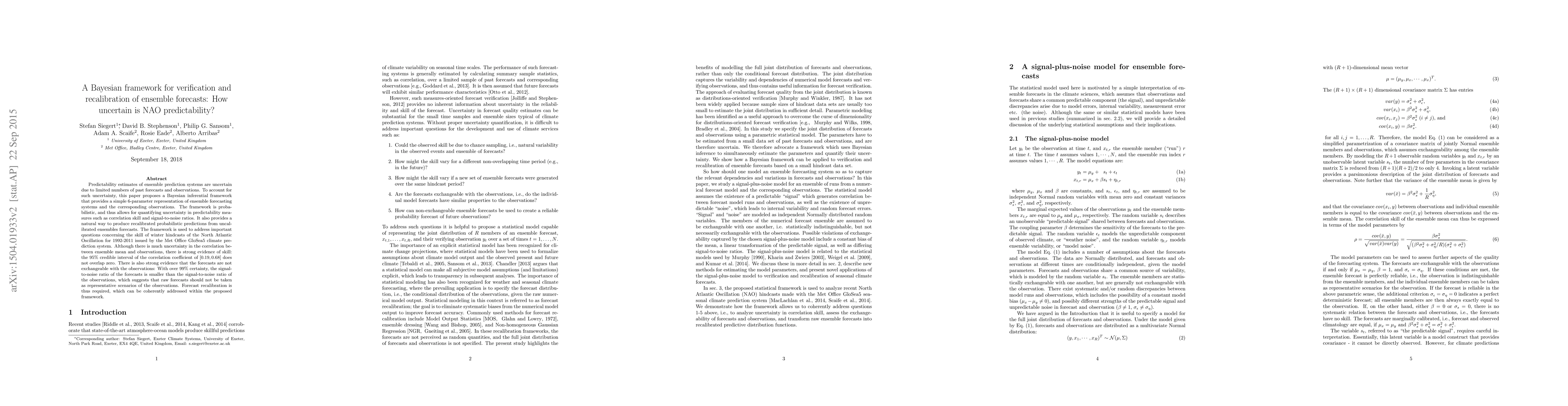 This paper proposes a Bayesian framework to quantify uncertainty in ensemble forecast predictability, applying it to winter hindcasts of the North Atlantic Oscillation. Despite significant uncertainty, there is strong evidence of forecast skill, though recalibrated predictions are necessary due to differences in signal-to-noise ratios.