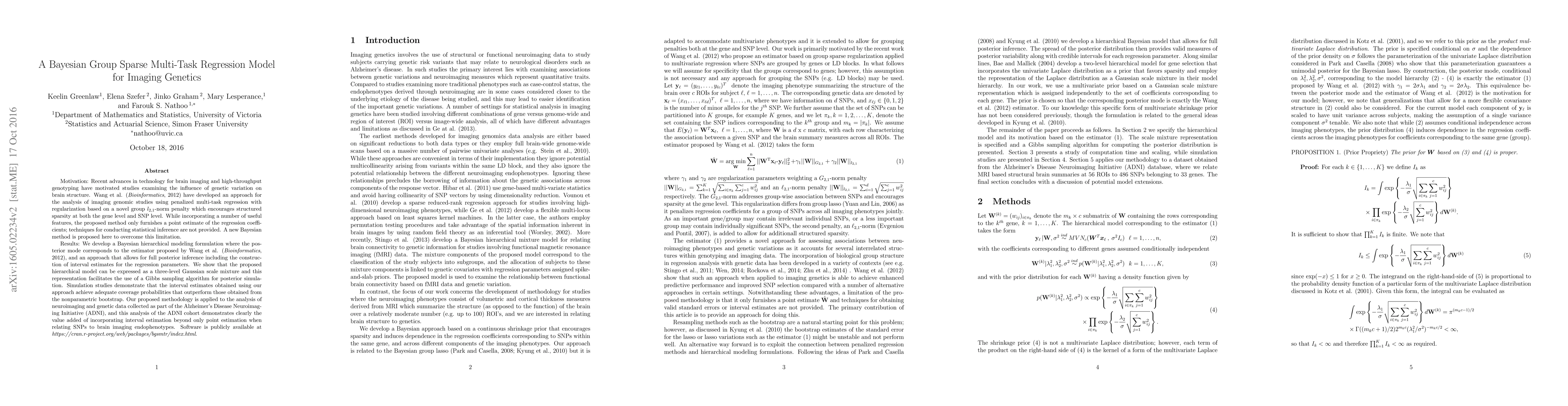 Motivation: Recent advances in technology for brain imaging and high-throughput genotyping have motivated studies examining the influence of genetic variation on brain structure. Wang et al. (Bioinformatics, 2012) have developed an approach for the analysis of imaging genomic studies using penalized multi-task regression with regularization based on a novel group $l_{2,1}$-norm penalty which encourages structured sparsity at both the gene level and SNP level. While incorporating a number of useful features, the proposed method only furnishes a point estimate of the regression coefficients; techniques for conducting statistical inference are not provided. A new Bayesian method is proposed here to overcome this limitation. Results: We develop a Bayesian hierarchical modeling formulation where the posterior mode corresponds to the estimator proposed by Wang et al. (Bioinformatics, 2012), and an approach that allows for full posterior inference including the construction of interval estimates for the regression parameters. We show that the proposed hierarchical model can be expressed as a three-level Gaussian scale mixture and this representation facilitates the use of a Gibbs sampling algorithm for posterior simulation. Simulation studies demonstrate that the interval estimates obtained using our approach achieve adequate coverage probabilities that outperform those obtained from the nonparametric bootstrap. Our proposed methodology is applied to the analysis of neuroimaging and genetic data collected as part of the Alzheimer's Disease Neuroimaging Initiative (ADNI), and this analysis of the ADNI cohort demonstrates clearly the value added of incorporating interval estimation beyond only point estimation when relating SNPs to brain imaging endophenotypes.