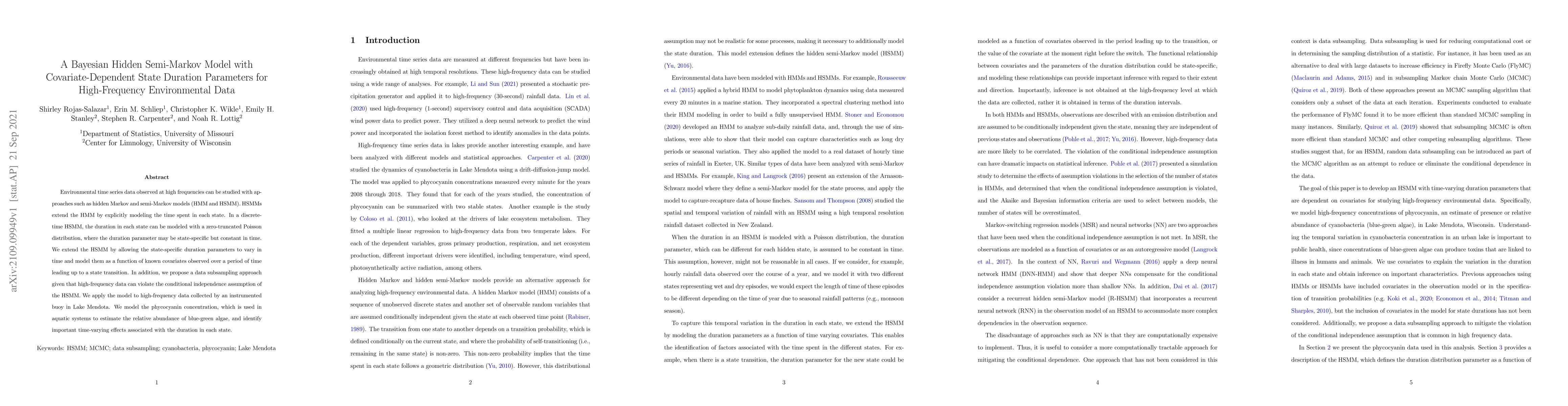 This paper proposes a Bayesian Hidden Semi-Markov Model with covariate-dependent state duration parameters to analyze high-frequency environmental data. The model allows state duration parameters to vary over time based on observed covariates, addressing the conditional independence assumption issue in high-frequency data.