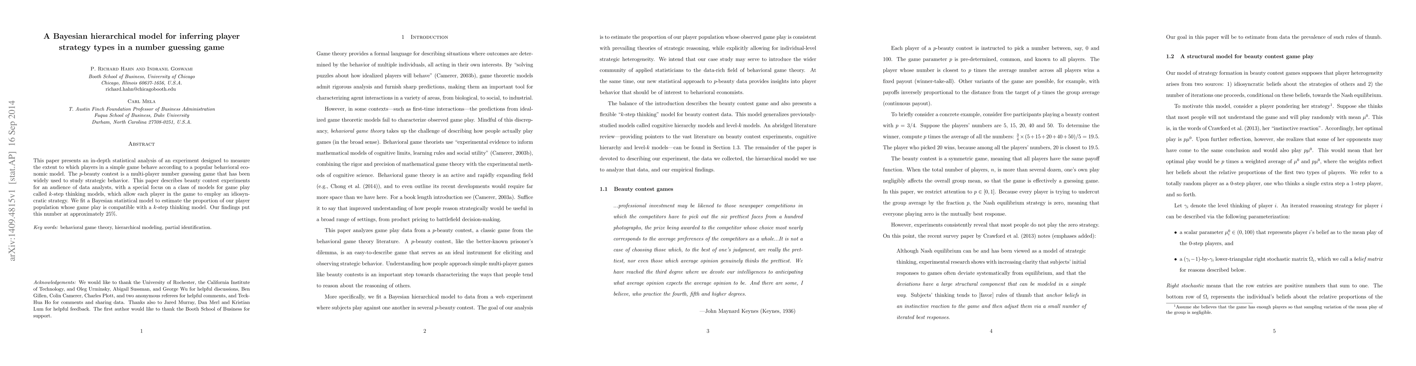 This paper uses a Bayesian hierarchical model to analyze player strategies in a number guessing game, finding that about 25% of players follow a k-step thinking model, a popular behavioral economic approach. The study focuses on the p-beauty contest game to explore strategic behavior.