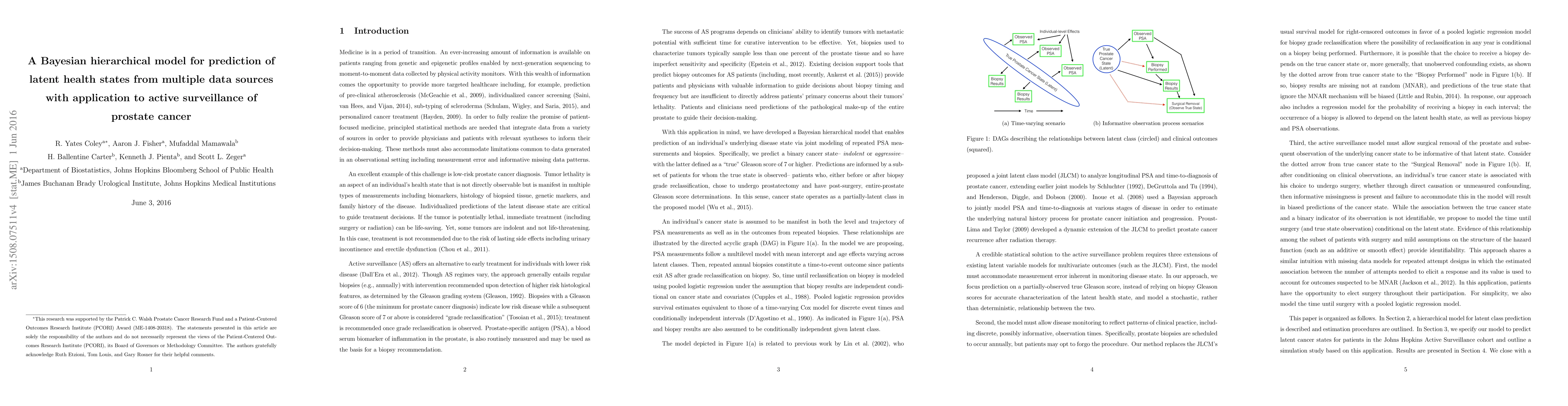 This paper introduces a Bayesian hierarchical model to predict latent health states from multiple data sources, improving clinical decisions for prostate cancer surveillance. The model addresses measurement errors and informative missingness, enabling predictions of aggressive versus indolent cancer states, demonstrated with data from Johns Hopkins University.