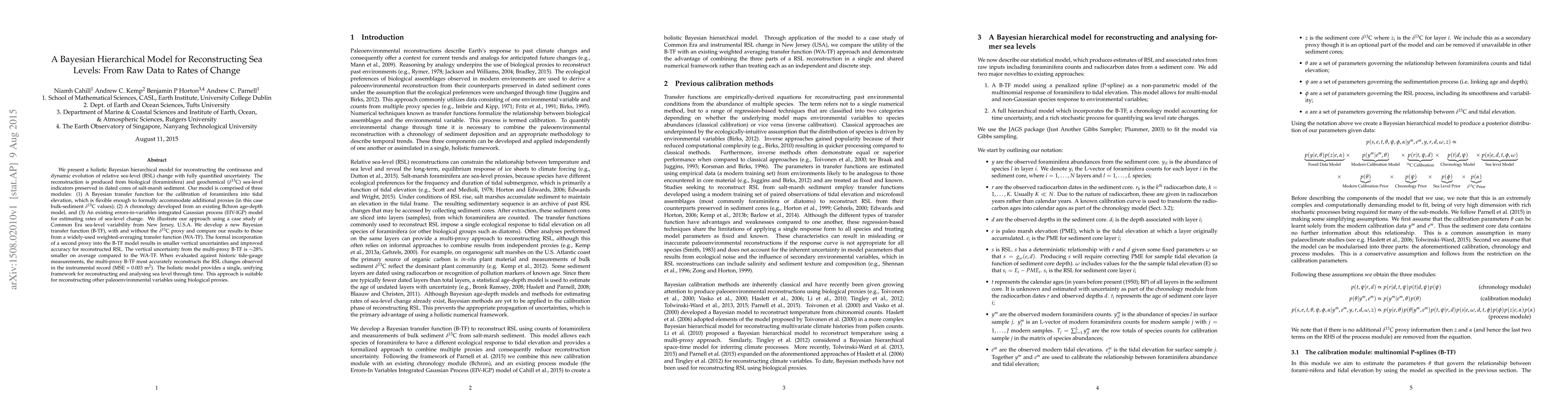 This research introduces a Bayesian hierarchical model to reconstruct sea-level changes using biological and geochemical proxies from sediment cores. The model, tested on a New Jersey case study, shows improved accuracy and smaller uncertainties compared to a traditional method, demonstrating its potential for paleoenvironmental variable reconstructions.