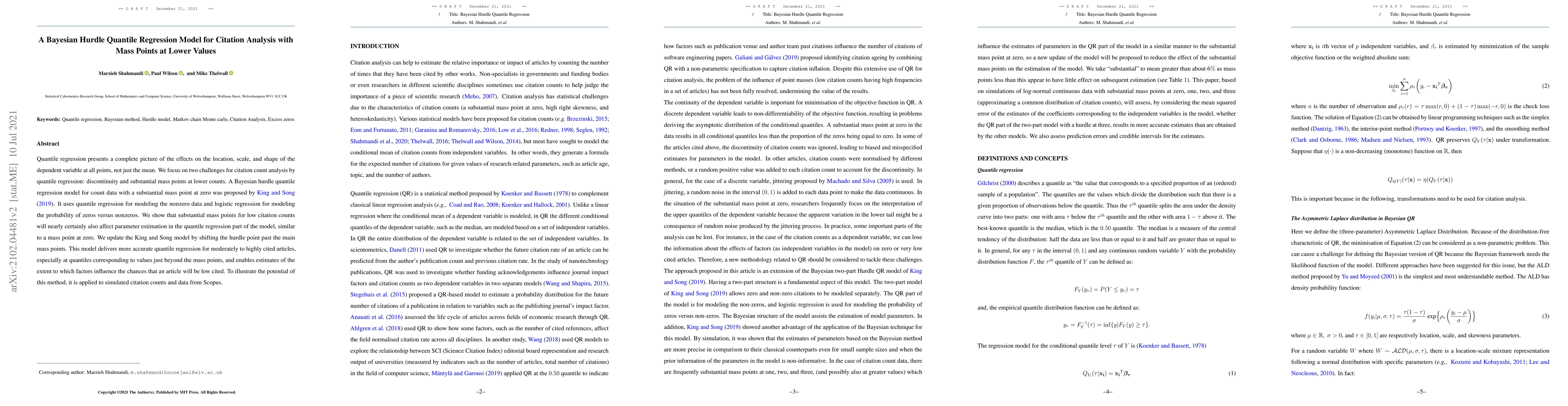 Quantile regression presents a complete picture of the effects on the location, scale, and shape of the dependent variable at all points, not just the mean. We focus on two challenges for citation count analysis by quantile regression: discontinuity and substantial mass points at lower counts. A Bayesian hurdle quantile regression model for count data with a substantial mass point at zero was proposed by King and Song (2019). It uses quantile regression for modeling the nonzero data and logistic regression for modeling the probability of zeros versus nonzeros. We show that substantial mass points for low citation counts will nearly certainly also affect parameter estimation in the quantile regression part of the model, similar to a mass point at zero. We update the King and Song model by shifting the hurdle point past the main mass points. This model delivers more accurate quantile regression for moderately to highly cited articles, especially at quantiles corresponding to values just beyond the mass points, and enables estimates of the extent to which factors influence the chances that an article will be low cited. To illustrate the potential of this method, it is applied to simulated citation counts and data from Scopus.