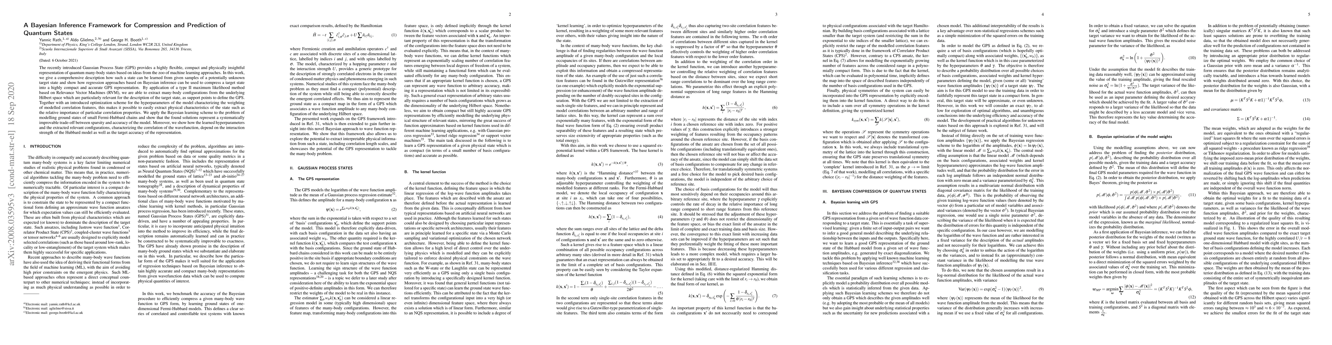This research introduces a Bayesian inference framework using Gaussian Process State (GPS) to compress and predict quantum many-body states. The method learns target states from samples, identifies relevant configurations, and optimizes hyperparameters for correlation feature weighting. Applied to Fermi-Hubbard chains, it demonstrates a balance between sparsity and accuracy, and reveals how hyperparameters and configurations depend on interaction strength and target representation accuracy.