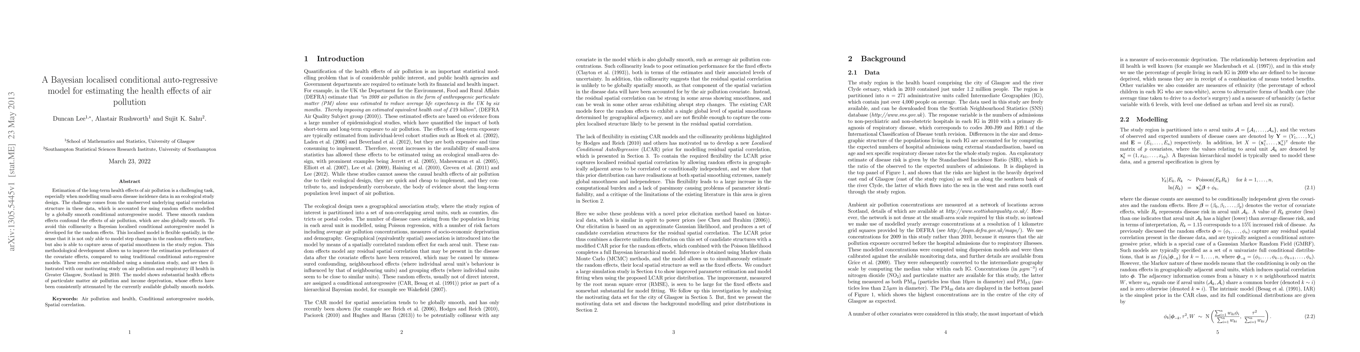 This paper develops a Bayesian localised conditional auto-regressive model to better estimate the health effects of air pollution, addressing the issue of collinearity between air pollution and underlying spatial correlations. The localised model improves estimation performance compared to traditional models, as demonstrated through a simulation study and an application to air pollution and respiratory health in Greater Glasgow.