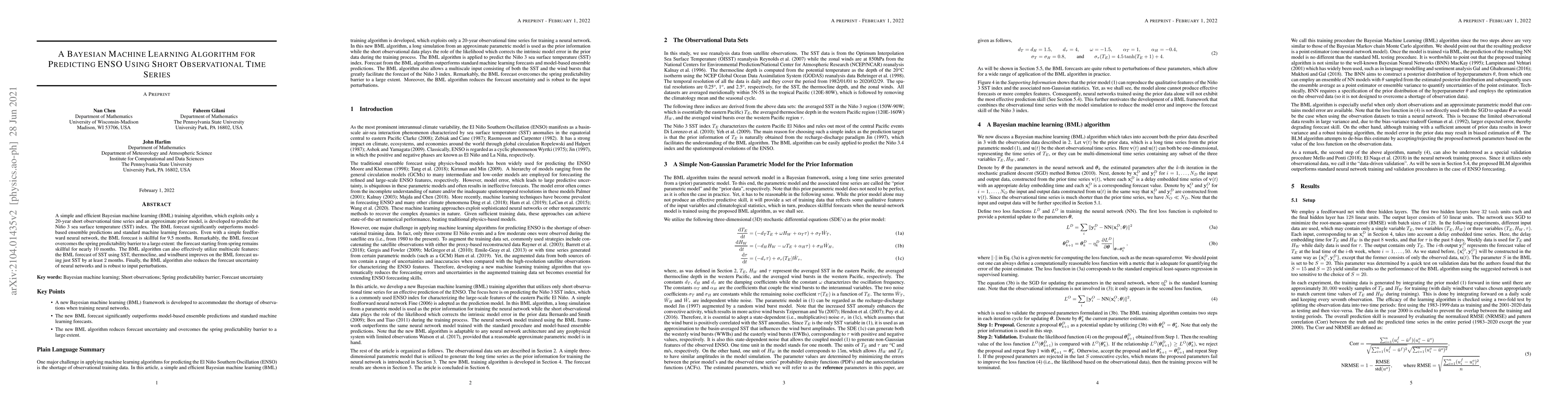 A new Bayesian machine learning algorithm outperforms existing forecasts for predicting ENSO events using short observational time series, with skillful predictions extending up to 10 months.