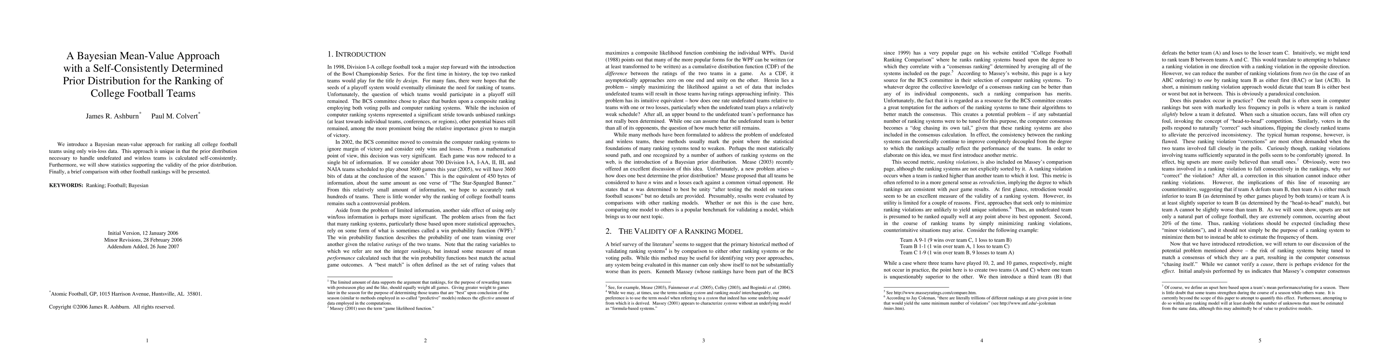 We introduce a Bayesian mean-value approach for ranking all college football teams using only win-loss data. This approach is unique in that the prior distribution necessary to handle undefeated and winless teams is calculated self-consistently. Furthermore, we will show statistics supporting the validity of the prior distribution. Finally, a brief comparison with other football rankings will be presented.