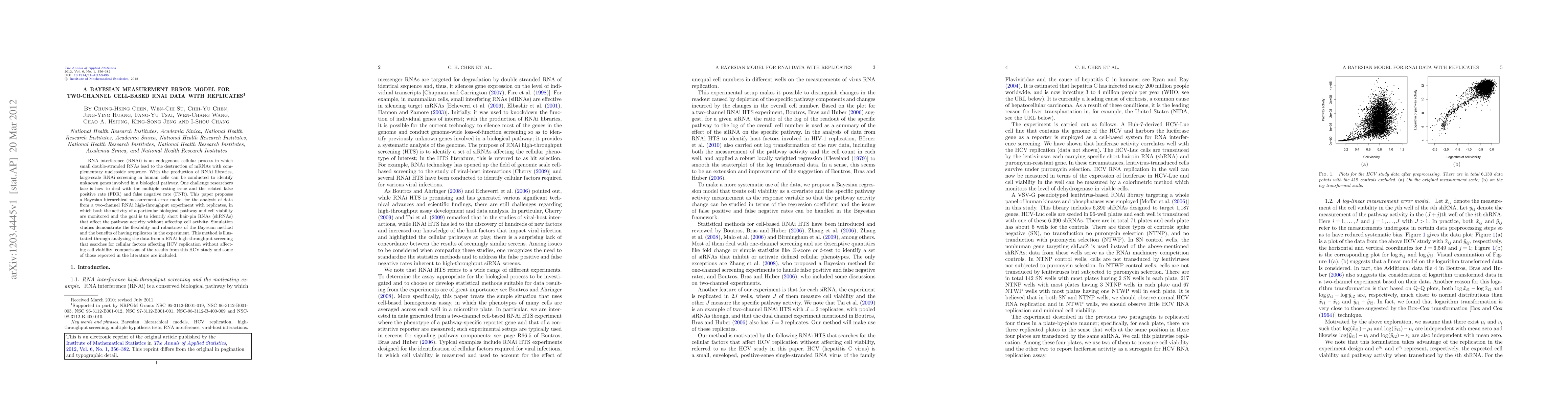 Researchers developed a Bayesian measurement error model to analyze RNAi data from two-channel experiments with replicates, aiming to identify shRNAs affecting biological pathways without impacting cell viability. The method demonstrated flexibility and robustness through simulation studies and was applied to a real-world RNAi screening for HCV replication.