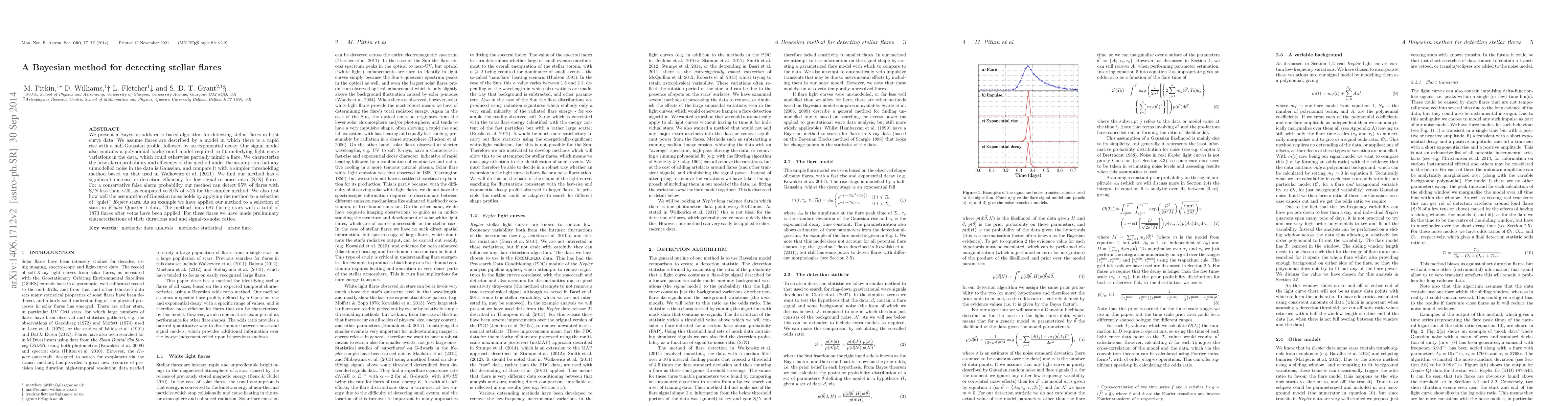 This paper introduces a Bayesian-odds-ratio-based algorithm for detecting stellar flares in light curve data, significantly improving efficiency for low signal-to-noise flares compared to a simpler thresholding method. The method identifies 687 flaring stars with 1873 flares in Kepler Quarter 1 data.