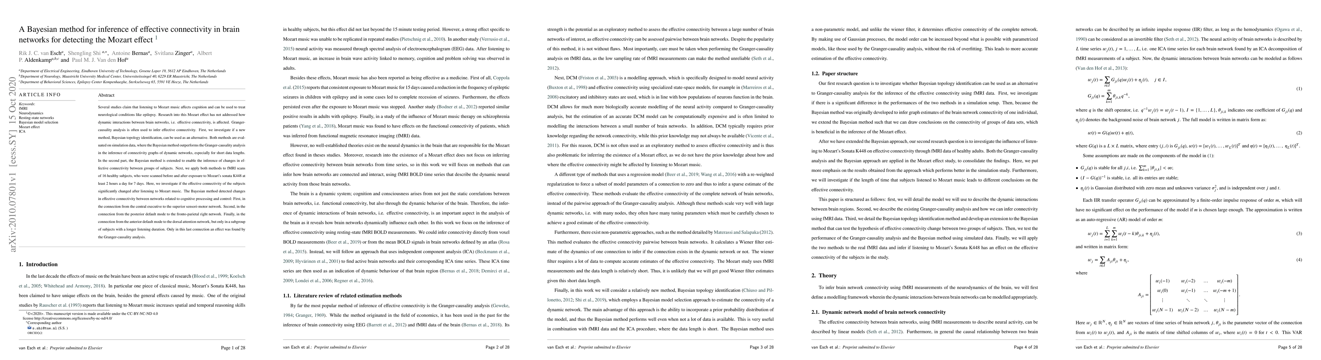 Several studies claim that listening to Mozart music affects cognition and can be used to treat neurological conditions like epilepsy. Research into this Mozart effect has not addressed how dynamic interactions between brain networks, i.e. effective connectivity, are affected. The Granger-causality analysis is often used to infer effective connectivity. First, we investigate if a new method, Bayesian topology identification, can be used as an alternative. Both methods are evaluated on simulation data, where the Bayesian method outperforms the Granger-causality analysis in the inference of connectivity graphs of dynamic networks, especially for short data lengths. In the second part, the Bayesian method is extended to enable the inference of changes in effective connectivity between groups of subjects. Next, we apply both methods to fMRI scans of 16 healthy subjects, who were scanned before and after exposure to Mozart's sonata K448 at least 2 hours a day for 7 days. Here, we investigate if the effective connectivity of the subjects significantly changed after listening to Mozart music. The Bayesian method detected changes in effective connectivity between networks related to cognitive processing and control: First, in the connection from the central executive to the superior sensori-motor network. Second, in the connection from the posterior default mode to the fronto-parietal right network. Finally, in the connection from the anterior default mode to the dorsal attention network, but only in a subgroup of subjects with a longer listening duration. Only in this last connection an effect was found by the Granger-causality analysis.