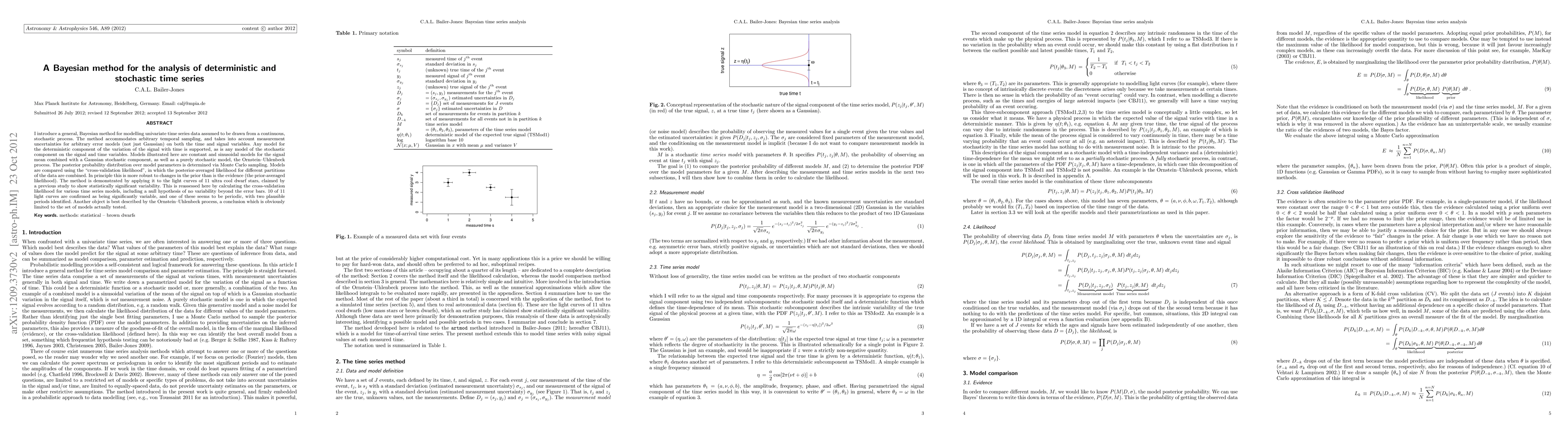 I introduce a general, Bayesian method for modelling univariate time series data assumed to be drawn from a continuous, stochastic process. The method accommodates arbitrary temporal sampling, and takes into account measurement uncertainties for arbitrary error models (not just Gaussian) on both the time and signal variables. Any model for the deterministic component of the variation of the signal with time is supported, as is any model of the stochastic component on the signal and time variables. Models illustrated here are constant and sinusoidal models for the signal mean combined with a Gaussian stochastic component, as well as a purely stochastic model, the Ornstein-Uhlenbeck process. The posterior probability distribution over model parameters is determined via Monte Carlo sampling. Models are compared using the "cross-validation likelihood", in which the posterior-averaged likelihood for different partitions of the data are combined. In principle this is more robust to changes in the prior than is the evidence (the prior-averaged likelihood). The method is demonstrated by applying it to the light curves of 11 ultra cool dwarf stars, claimed by a previous study to show statistically significant variability. This is reassessed here by calculating the cross-validation likelihood for various time series models, including a null hypothesis of no variability beyond the error bars. 10 of 11 light curves are confirmed as being significantly variable, and one of these seems to be periodic, with two plausible periods identified. Another object is best described by the Ornstein-Uhlenbeck process, a conclusion which is obviously limited to the set of models actually tested.