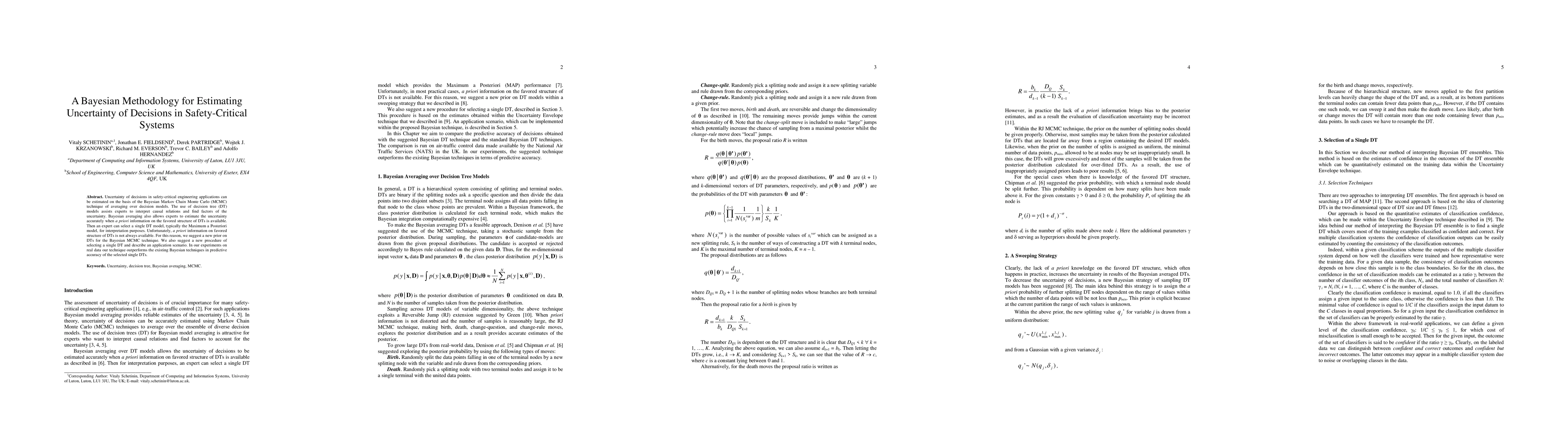 This paper proposes a Bayesian methodology using Markov Chain Monte Carlo (MCMC) to estimate decision uncertainty in safety-critical systems, employing decision tree models to interpret causal relations. It introduces a new prior on decision trees and a selection procedure for a single tree, improving predictive accuracy over existing techniques, as demonstrated in experiments with Short-Term Conflict Alert data.