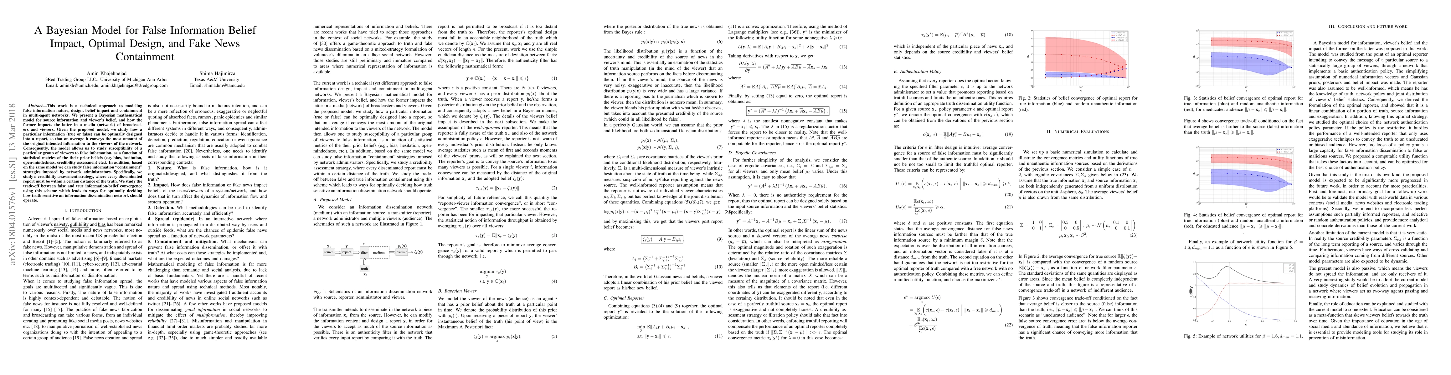 This work is a technical approach to modeling false information nature, design, belief impact and containment in multi-agent networks. We present a Bayesian mathematical model for source information and viewer's belief, and how the former impacts the latter in a media (network) of broadcasters and viewers. Given the proposed model, we study how a particular information (true or false) can be optimally designed into a report, so that on average it conveys the most amount of the original intended information to the viewers of the network. Consequently, the model allows us to study susceptibility of a particular group of viewers to false information, as a function of statistical metrics of the their prior beliefs (e.g. bias, hesitation, open-mindedness, credibility assessment etc.). In addition, based on the same model we can study false information "containment" strategies imposed by network administrators. Specifically, we study a credibility assessment strategy, where every disseminated report must be within a certain distance of the truth. We study the trade-off between false and true information-belief convergence using this scheme which leads to ways for optimally deciding how truth sensitive an information dissemination network should operate.