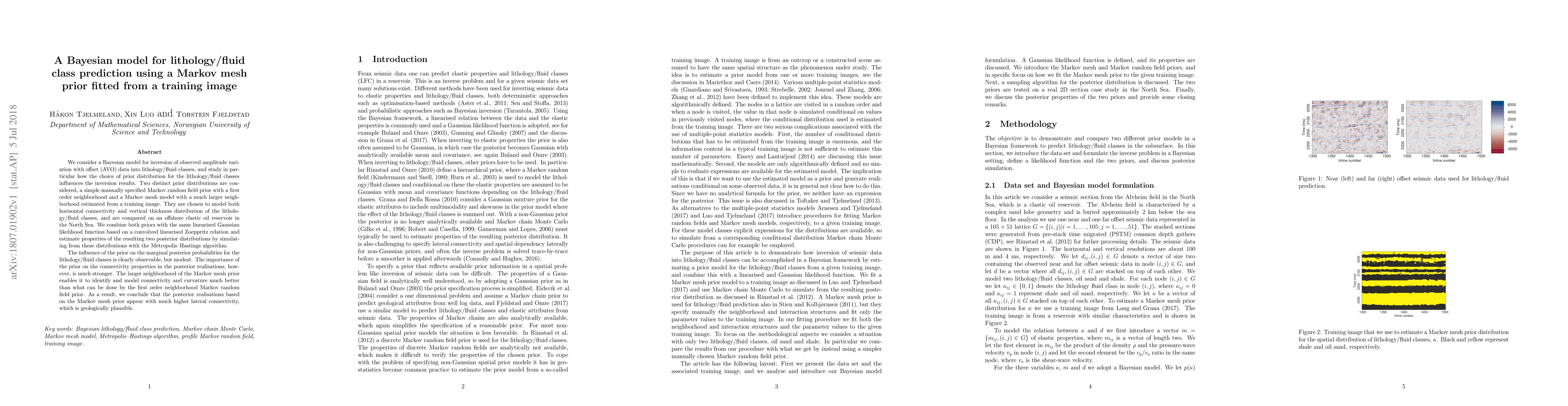 A Bayesian model uses a Markov mesh prior to predict lithology/fluid classes in oil reservoirs, with results showing that the larger neighborhood of the prior improves connectivity modeling and is geologically plausible.
