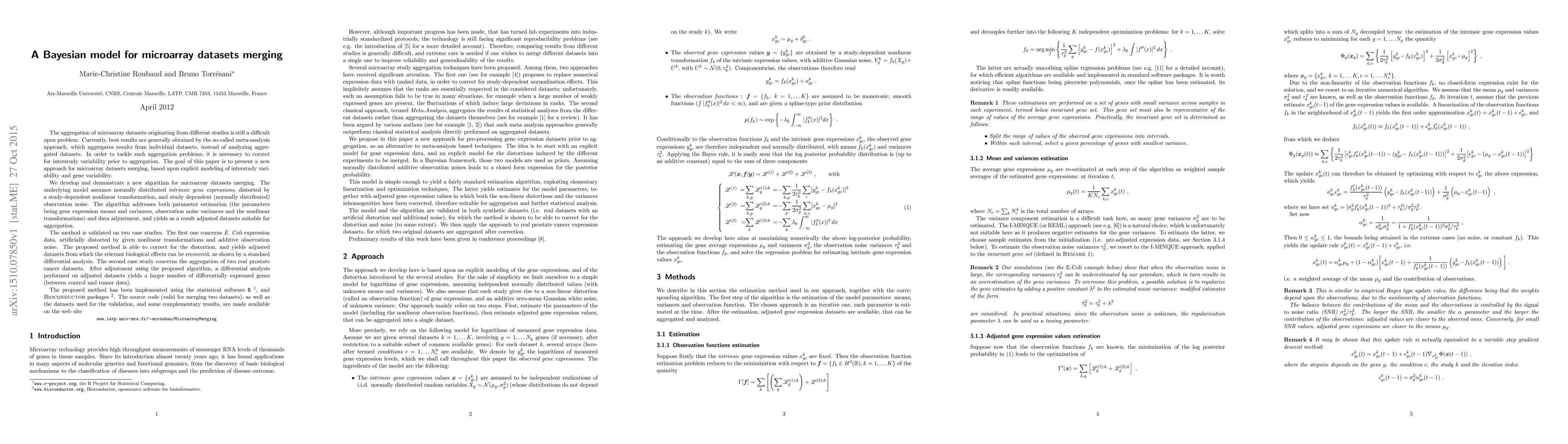 The aggregation of microarray datasets originating from different studies is still a difficult open problem. Currently, best results are generally obtained by the so-called meta-analysis approach, which aggregates results from individual datasets, instead of analyzing aggre-gated datasets. In order to tackle such aggregation problems, it is necessary to correct for interstudy variability prior to aggregation. The goal of this paper is to present a new approach for microarray datasets merging, based upon explicit modeling of interstudy variability and gene variability. We develop and demonstrate a new algorithm for microarray datasets merging. The underlying model assumes normally distributed intrinsic gene expressions, distorted by a study-dependent nonlinear transformation, and study dependent (normally distributed) observation noise. The algorithm addresses both parameter estimation (the parameters being gene expression means and variances, observation noise variances and the nonlinear transformations) and data adjustment, and yields as a result adjusted datasets suitable for aggregation. The method is validated on two case studies. The first one concerns E. Coli expression data, artificially distorted by given nonlinear transformations and additive observation noise. The proposed method is able to correct for the distortion, and yields adjusted datasets from which the relevant biological effects can be recovered, as shown by a standard differential analysis. The second case study concerns the aggregation of two real prostate cancer datasets. After adjustment using the proposed algorithm, a differential analysis performed on adjusted datasets yields a larger number of differentially expressed genes (between control and tumor data). The proposed method has been implemented using the statistical software R 1, and Bioconductor packages 2. The source code (valid for merging two datasets), as well as the datasets used for the validation, and some complementary results, are made available on the web site