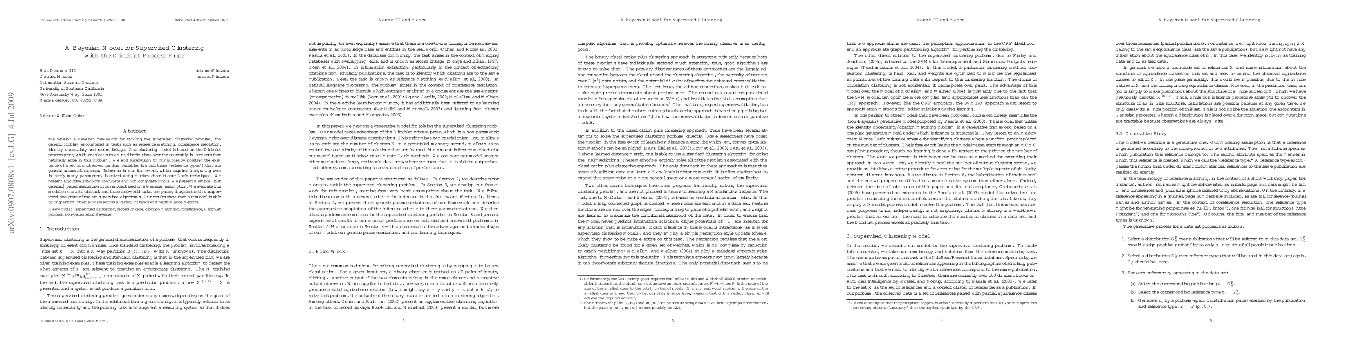 We develop a Bayesian framework for tackling the supervised clustering problem, the generic problem encountered in tasks such as reference matching, coreference resolution, identity uncertainty and record linkage. Our clustering model is based on the Dirichlet process prior, which enables us to define distributions over the countably infinite sets that naturally arise in this problem. We add supervision to our model by positing the existence of a set of unobserved random variables (we call these "reference types") that are generic across all clusters. Inference in our framework, which requires integrating over infinitely many parameters, is solved using Markov chain Monte Carlo techniques. We present algorithms for both conjugate and non-conjugate priors. We present a simple--but general--parameterization of our model based on a Gaussian assumption. We evaluate this model on one artificial task and three real-world tasks, comparing it against both unsupervised and state-of-the-art supervised algorithms. Our results show that our model is able to outperform other models across a variety of tasks and performance metrics.