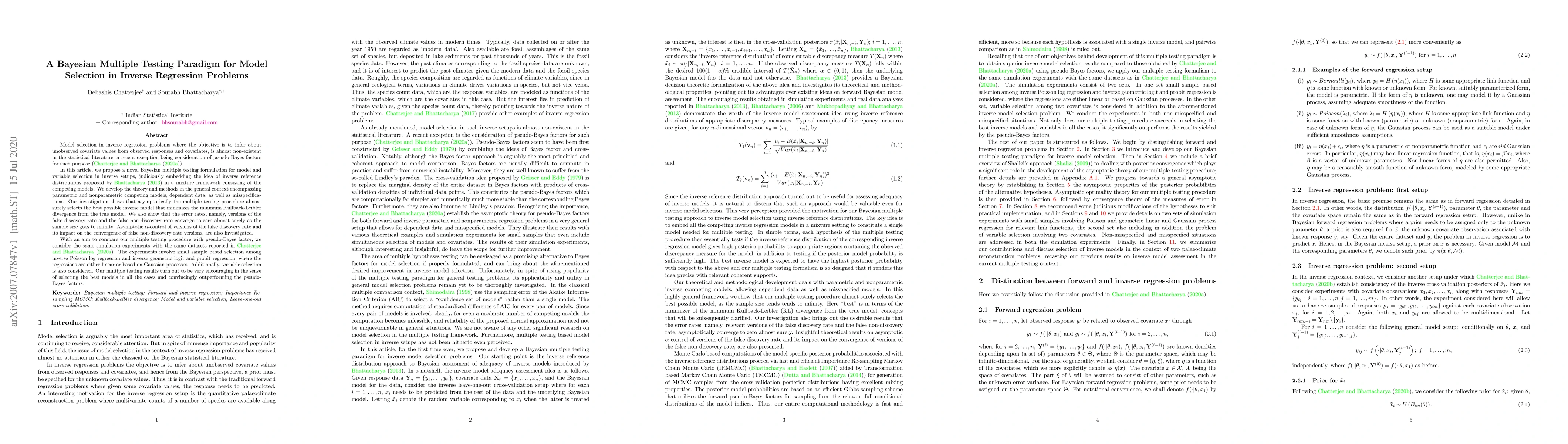 This paper introduces a Bayesian multiple testing paradigm for model and variable selection in inverse regression problems, embedding inverse reference distributions within a mixture framework. The proposed method asymptotically selects the best model minimizing Kullback-Leibler divergence, with error rates converging to zero as sample size increases. Simulation results show promising performance in selecting optimal models in both misspecified and non-misspecified scenarios.