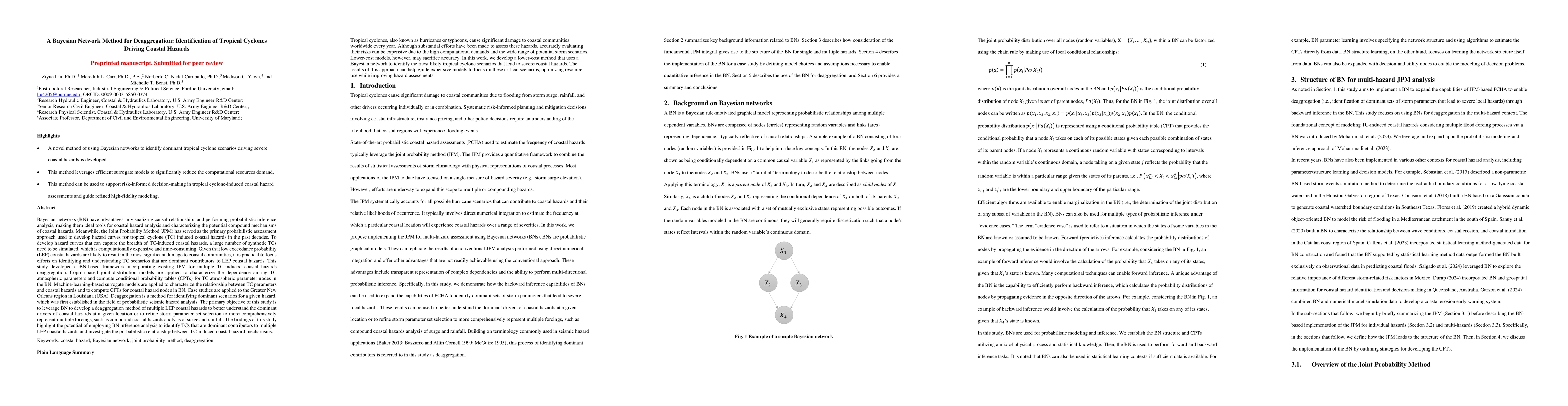 This work is novel by applying Bayesian Networks to deaggregation for multiple coastal hazards, combining JPM with copula-based models and machine learning surrogates to create comprehensive CPTs for hazard nodes.