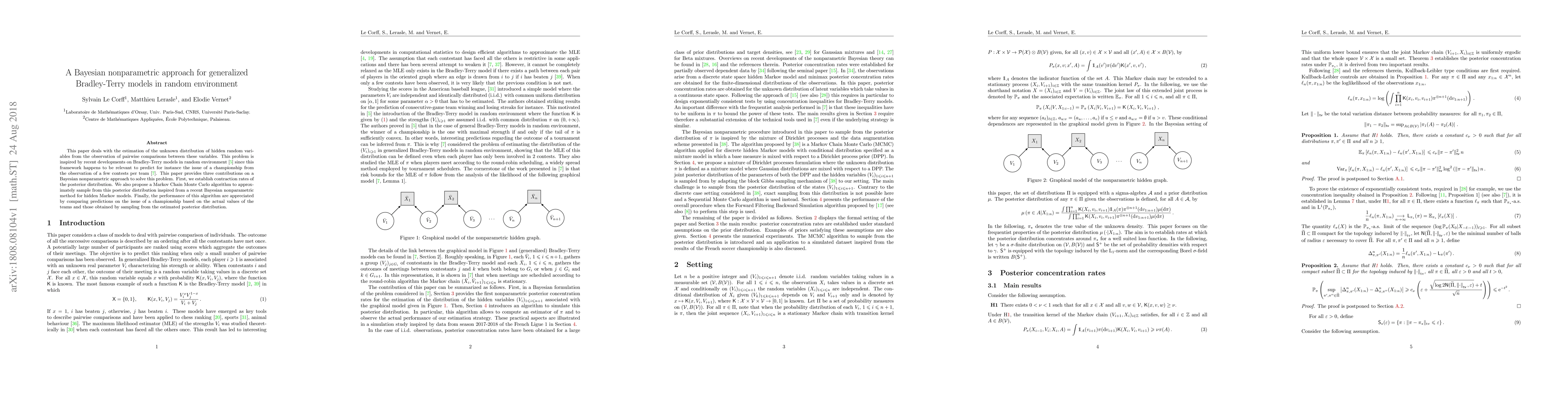 This paper proposes a Bayesian nonparametric method for estimating the distribution of hidden random variables in generalized Bradley-Terry models in random environment. It establishes contraction rates of the posterior distribution, introduces a Markov Chain Monte Carlo algorithm for posterior sampling, and evaluates its performance through championship prediction comparisons.