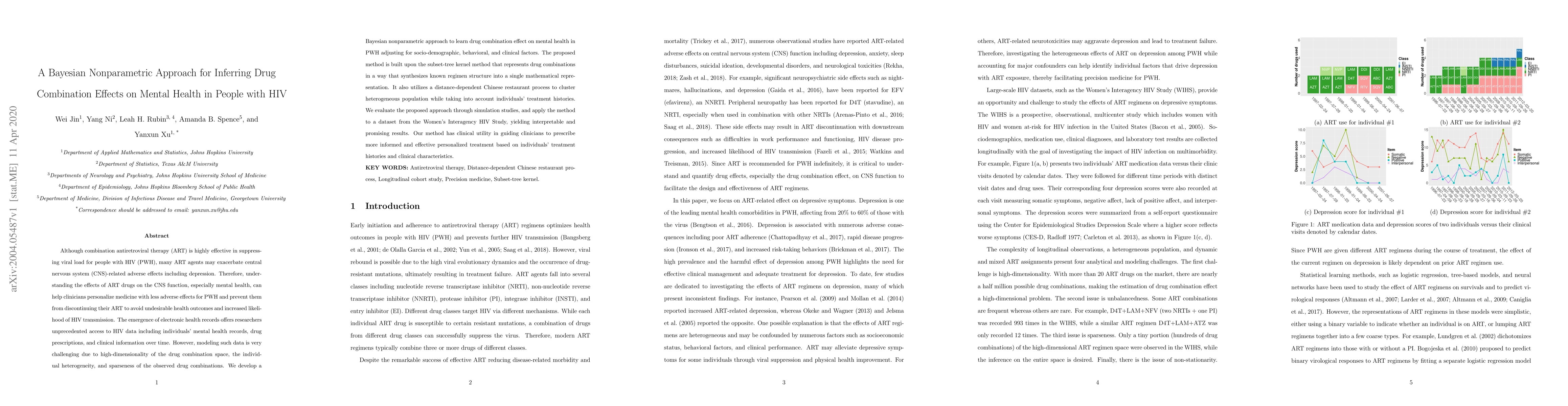 This paper proposes a Bayesian nonparametric approach to infer the effects of drug combinations on mental health in people with HIV, addressing the high-dimensionality and heterogeneity of the data. The method uses a subset-tree kernel and a distance-dependent Chinese restaurant process, and is shown to yield interpretable results that can guide personalized treatment plans.