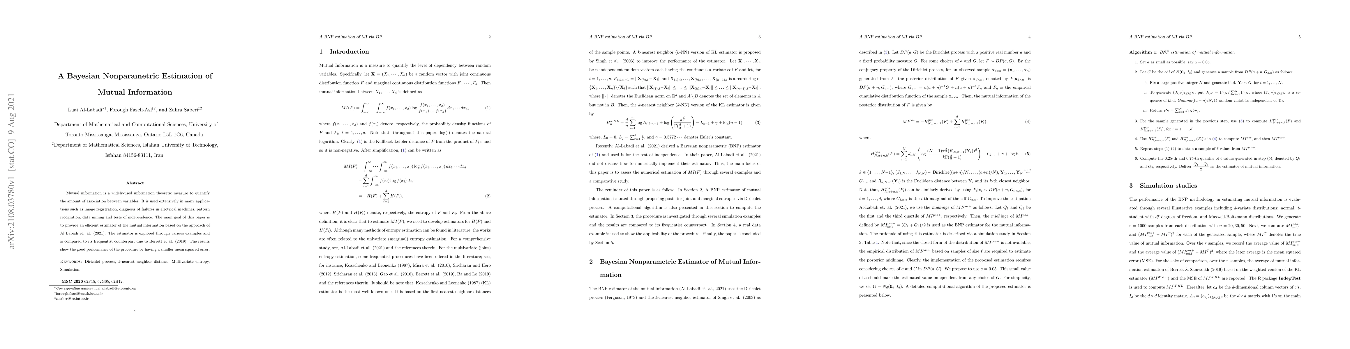 This paper proposes a Bayesian nonparametric estimator for mutual information, comparing it to a frequentist method and demonstrating its superior performance through smaller mean squared error in various applications.