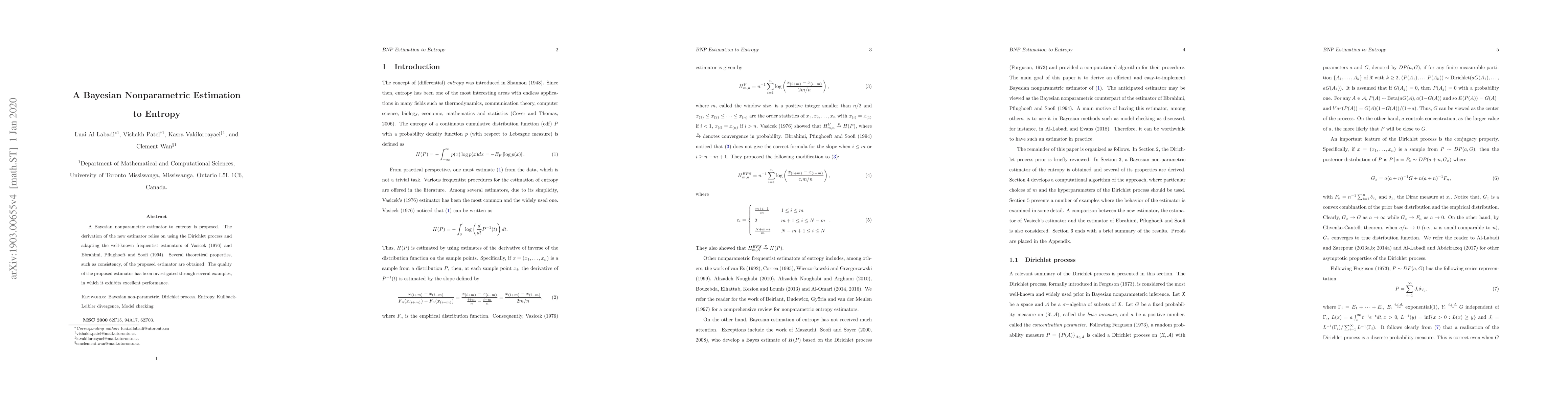 This paper proposes a Bayesian nonparametric estimator for entropy using the Dirichlet process, adapting frequentist estimators by Vasicek and Ebrahimi et al. Theoretical properties like consistency are demonstrated, and the estimator shows excellent performance in practical examples.