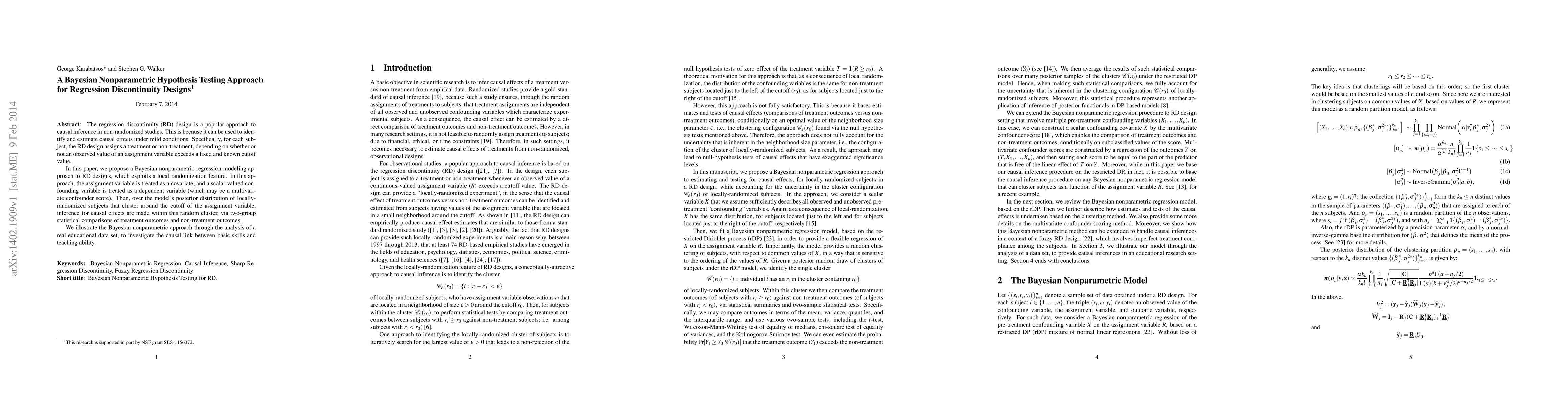 The regression discontinuity (RD) design is a popular approach to causal inference in non-randomized studies. This is because it can be used to identify and estimate causal effects under mild conditions. Specifically, for each subject, the RD design assigns a treatment or non-treatment, depending on whether or not an observed value of an assignment variable exceeds a fixed and known cutoff value. In this paper, we propose a Bayesian nonparametric regression modeling approach to RD designs, which exploits a local randomization feature. In this approach, the assignment variable is treated as a covariate, and a scalar-valued confounding variable is treated as a dependent variable (which may be a multivariate confounder score). Then, over the model's posterior distribution of locally-randomized subjects that cluster around the cutoff of the assignment variable, inference for causal effects are made within this random cluster, via two-group statistical comparisons of treatment outcomes and non-treatment outcomes. We illustrate the Bayesian nonparametric approach through the analysis of a real educational data set, to investigate the causal link between basic skills and teaching ability.