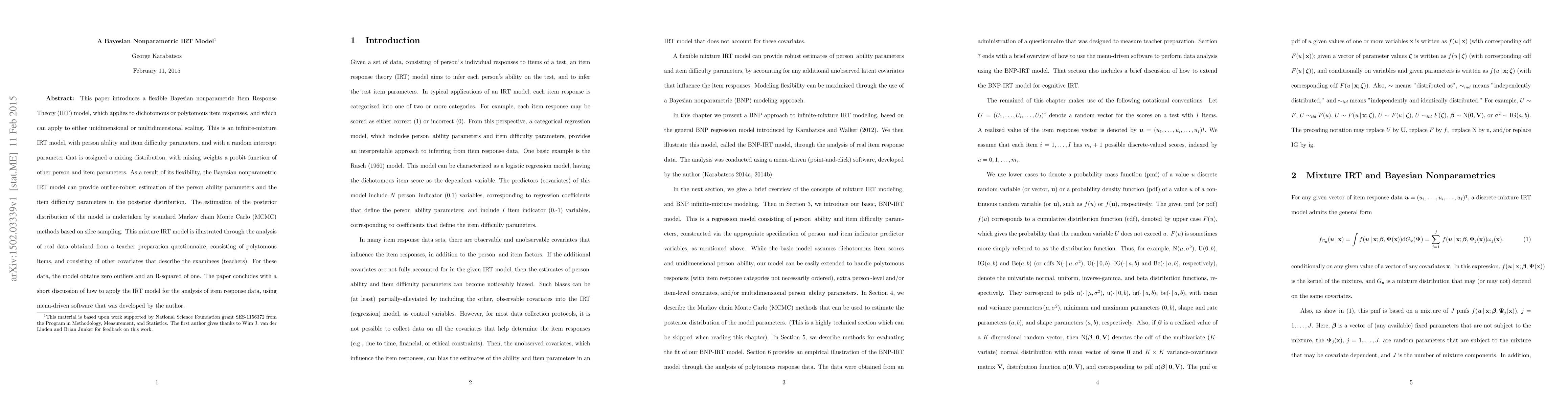 This paper introduces a flexible Bayesian nonparametric Item Response Theory (IRT) model, which applies to dichotomous or polytomous item responses, and which can apply to either unidimensional or multidimensional scaling. This is an infinite-mixture IRT model, with person ability and item difficulty parameters, and with a random intercept parameter that is assigned a mixing distribution, with mixing weights a probit function of other person and item parameters. As a result of its flexibility, the Bayesian nonparametric IRT model can provide outlier-robust estimation of the person ability parameters and the item difficulty parameters in the posterior distribution. The estimation of the posterior distribution of the model is undertaken by standard Markov chain Monte Carlo (MCMC) methods based on slice sampling. This mixture IRT model is illustrated through the analysis of real data obtained from a teacher preparation questionnaire, consisting of polytomous items, and consisting of other covariates that describe the examinees (teachers). For these data, the model obtains zero outliers and an R-squared of one. The paper concludes with a short discussion of how to apply the IRT model for the analysis of item response data, using menu-driven software that was developed by the author.