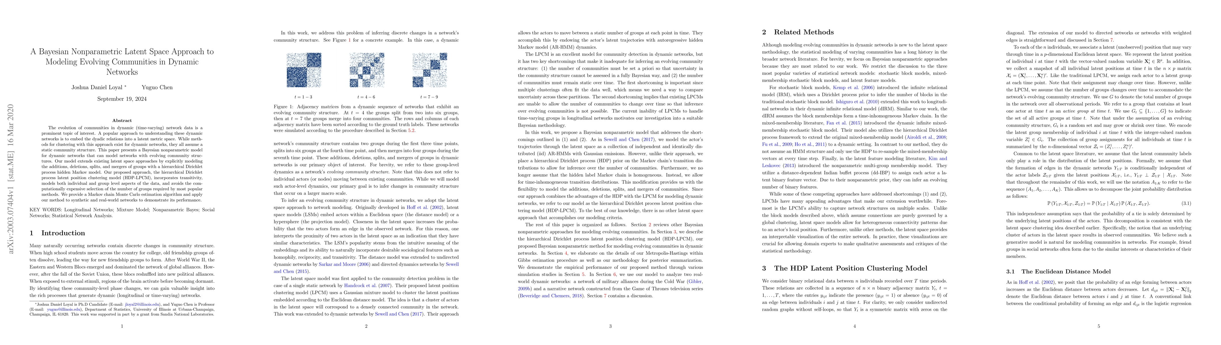 This paper introduces a Bayesian nonparametric model, the HDP-LPCM, to model evolving communities in dynamic networks by embedding dyadic relations into a latent metric space and explicitly handling group changes. It avoids the need for predefined group numbers and demonstrates its effectiveness through synthetic and real-world network data.
