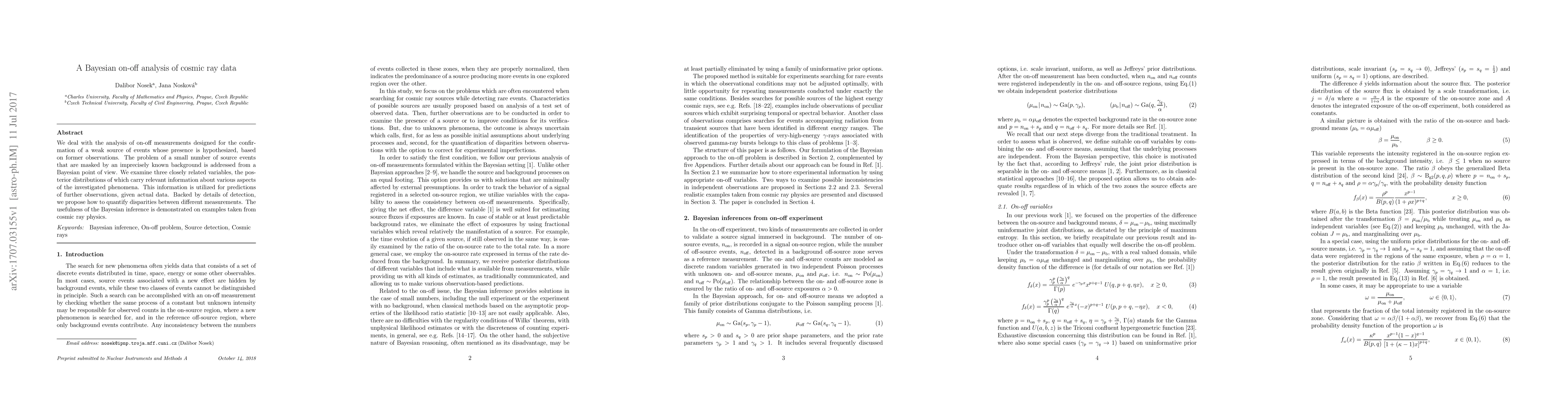 We deal with the analysis of on-off measurements designed for the confirmation of a weak source of events whose presence is hypothesized, based on former observations. The problem of a small number of source events that are masked by an imprecisely known background is addressed from a Bayesian point of view. We examine three closely related variables, the posterior distributions of which carry relevant information about various aspects of the investigated phenomena. This information is utilized for predictions of further observations, given actual data. Backed by details of detection, we propose how to quantify disparities between different measurements. The usefulness of the Bayesian inference is demonstrated on examples taken from cosmic ray physics.