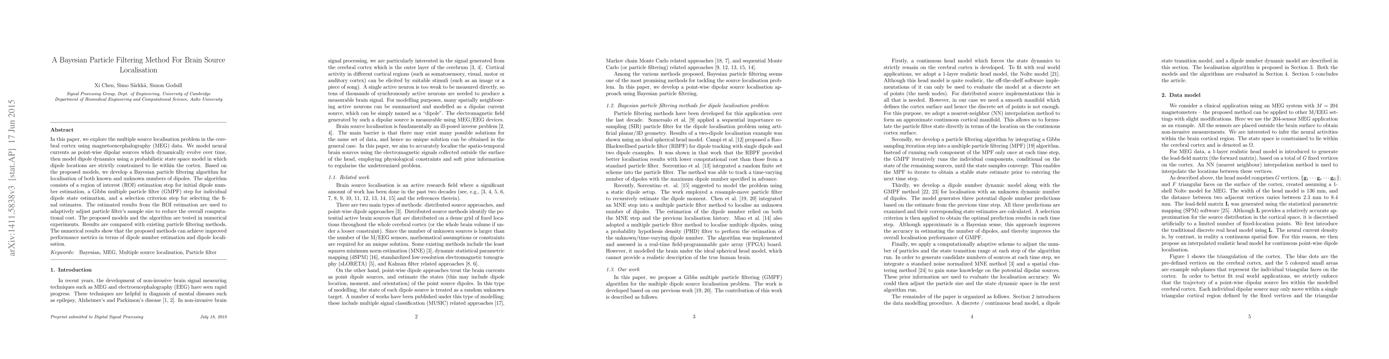 This research proposes a Bayesian particle filtering method for brain source localization using magnetoencephalography (MEG) data, modeling neural currents as point-wise dipolar sources that dynamically evolve over time within the cerebral cortex.