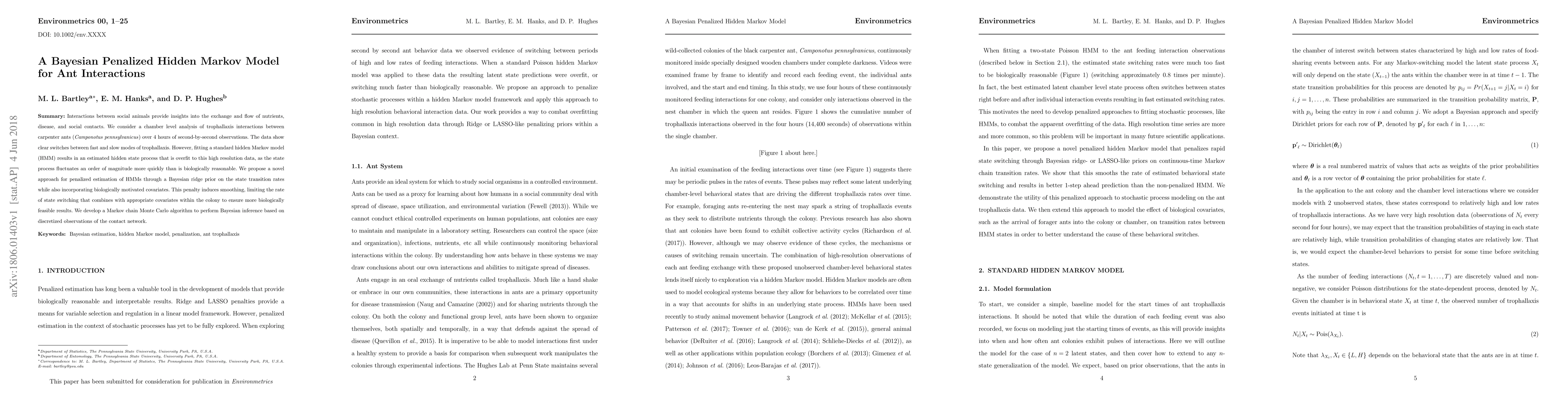 This research introduces a Bayesian penalized Hidden Markov Model to analyze trophallaxis interactions in carpenter ants, addressing overfitting from standard HMMs. The method incorporates biological covariates and uses MCMC for inference, yielding more realistic, smoother state transitions in ant behavior.