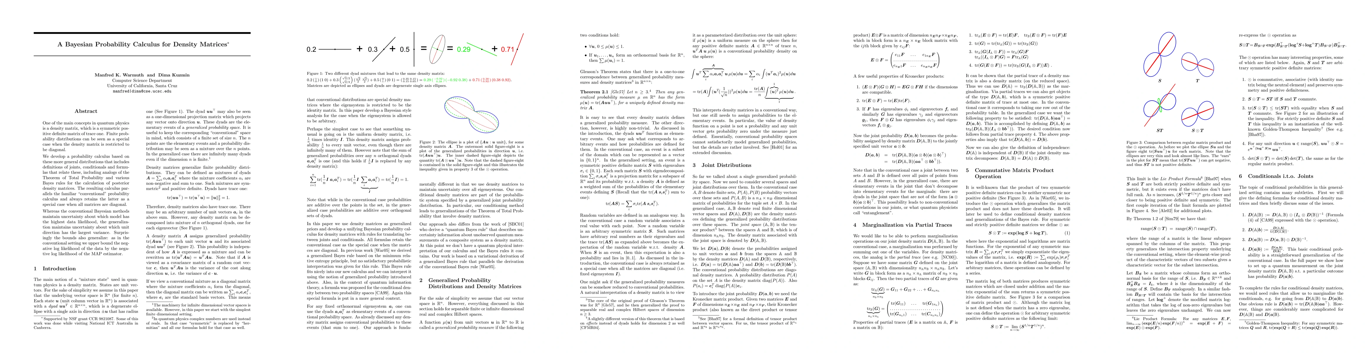 One of the main concepts in quantum physics is a density matrix, which is a symmetric positive definite matrix of trace one. Finite probability distributions are a special case where the density matrix is restricted to be diagonal. Density matrices are mixtures of dyads, where a dyad has the form uu' for any any unit column vector u. These unit vectors are the elementary events of the generalized probability space. Perhaps the simplest case to see that something unusual is going on is the case of uniform density matrix, i.e. 1/n times identity. This matrix assigns probability 1/n to every unit vector, but of course there are infinitely many of them. The new normalization rule thus says that sum of probabilities over any orthonormal basis of directions is one. We develop a probability calculus based on these more general distributions that includes definitions of joints, conditionals and formulas that relate these, i.e. analogs of the theorem of total probability, various Bayes rules for the calculation of posterior density matrices, etc. The resulting calculus parallels the familiar 'classical' probability calculus and always retains the latter as a special case when all matrices are diagonal. Whereas the classical Bayesian methods maintain uncertainty about which model is 'best', the generalization maintains uncertainty about which unit direction has the largest variance. Surprisingly the bounds also generalize: as in the classical setting we bound the negative log likelihood of the data by the negative log likelihood of the MAP estimator.