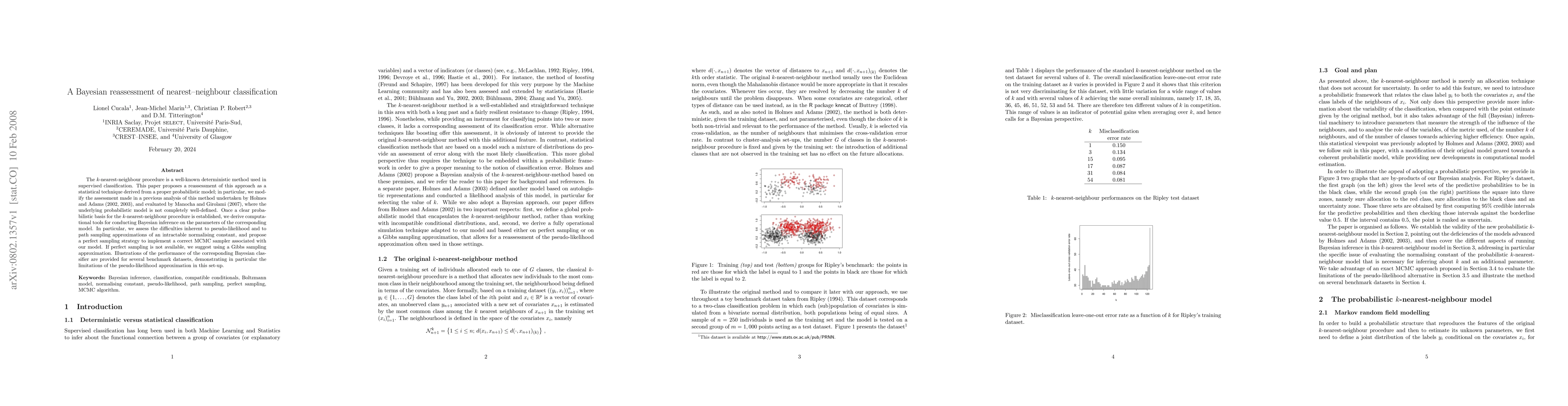 This paper reassesses the k-nearest-neighbour classification method from a Bayesian probabilistic perspective, proposing a well-defined probabilistic model and deriving computational tools for Bayesian inference. It evaluates the limitations of pseudo-likelihood and suggests perfect sampling or Gibbs sampling for MCMC, demonstrating improved performance over benchmark datasets.
