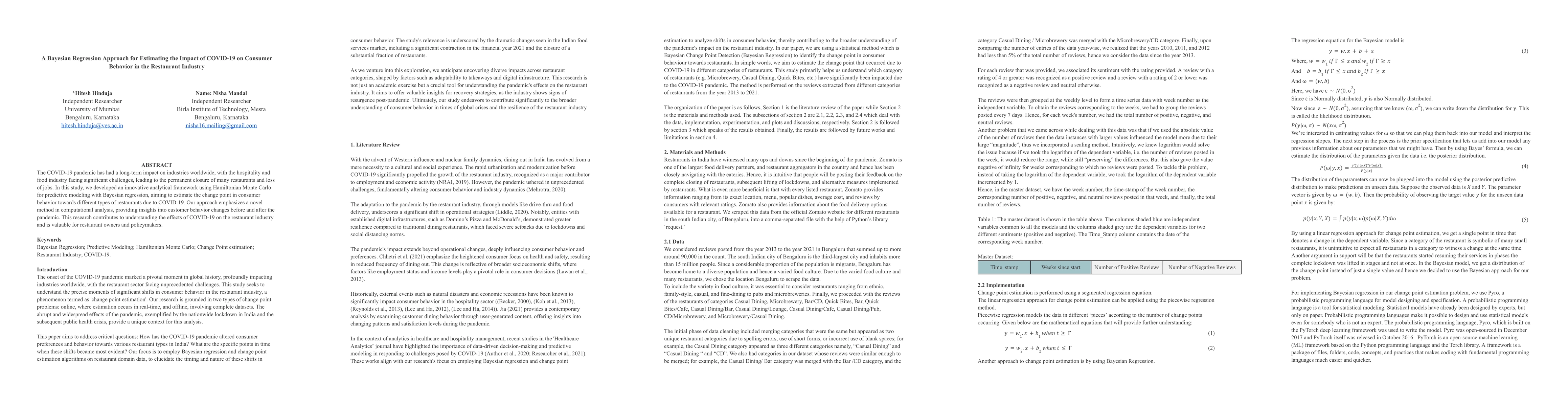 The paper proposes a Bayesian regression model with Hamiltonian Monte Carlo for predictive analysis to estimate shifts in consumer behavior in the restaurant industry post-COVID-19. It offers insights into behavioral changes before and after the pandemic, aiding restaurant owners and policymakers.