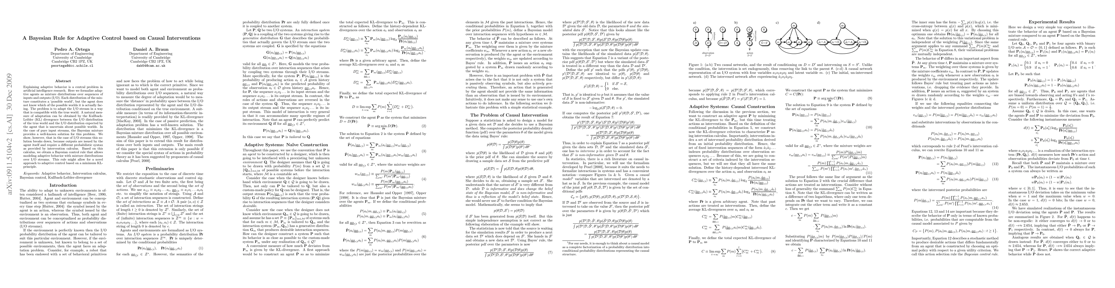 Explaining adaptive behavior is a central problem in artificial intelligence research. Here we formalize adaptive agents as mixture distributions over sequences of inputs and outputs (I/O). Each distribution of the mixture constitutes a `possible world', but the agent does not know which of the possible worlds it is actually facing. The problem is to adapt the I/O stream in a way that is compatible with the true world. A natural measure of adaptation can be obtained by the Kullback-Leibler (KL) divergence between the I/O distribution of the true world and the I/O distribution expected by the agent that is uncertain about possible worlds. In the case of pure input streams, the Bayesian mixture provides a well-known solution for this problem. We show, however, that in the case of I/O streams this solution breaks down, because outputs are issued by the agent itself and require a different probabilistic syntax as provided by intervention calculus. Based on this calculus, we obtain a Bayesian control rule that allows modeling adaptive behavior with mixture distributions over I/O streams. This rule might allow for a novel approach to adaptive control based on a minimum KL-principle.