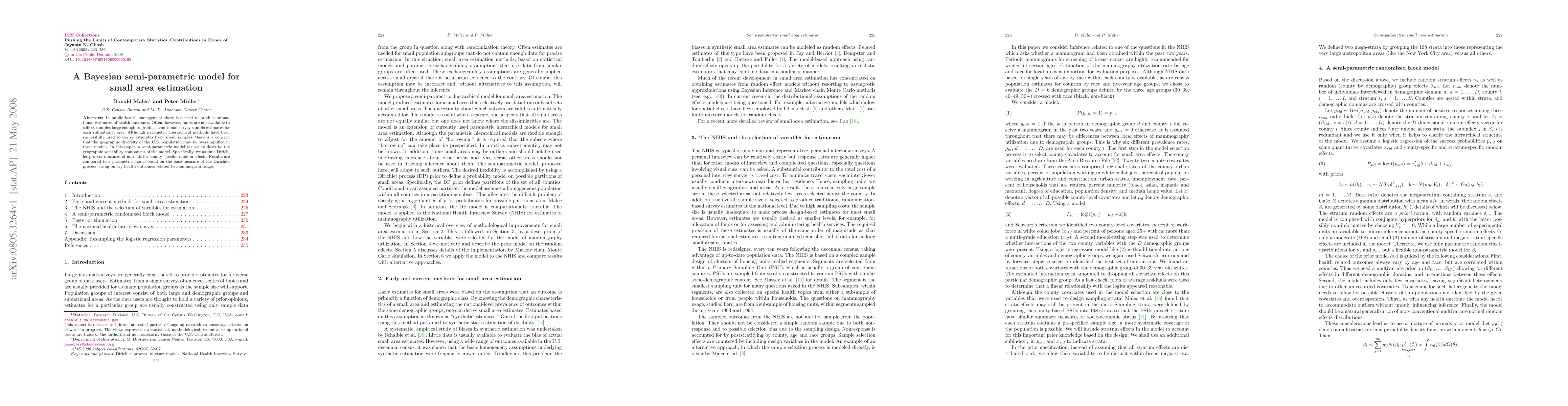This paper proposes a Bayesian semi-parametric model for small area estimation in public health, utilizing Dirichlet process mixtures of normals to capture geographic variability, and compares it to a traditional parametric model using binary health outcome data on mammogram usage.