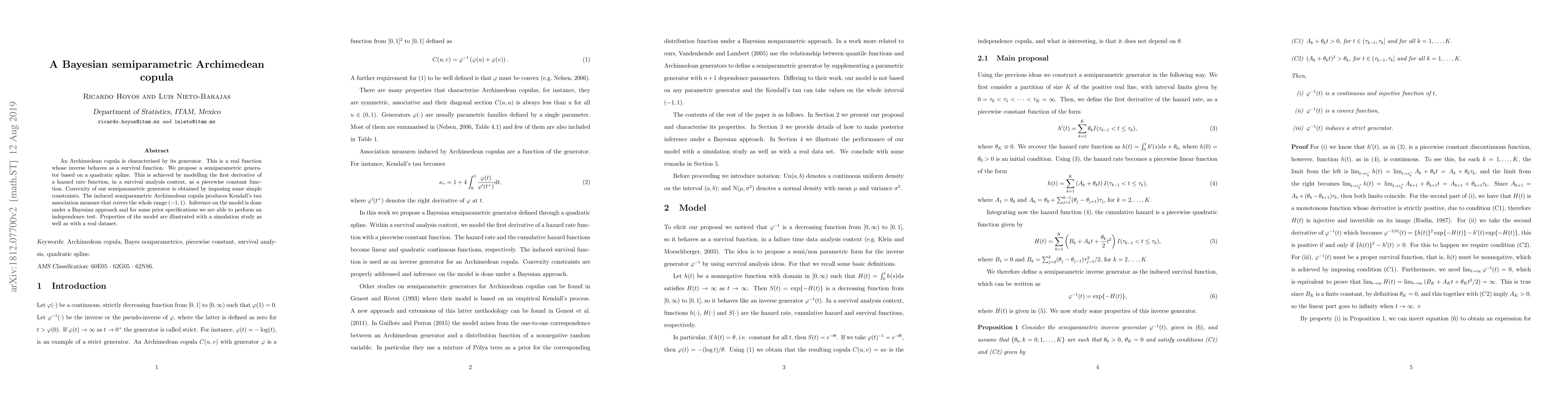 This paper proposes a semiparametric Bayesian Archimedean copula model based on a quadratic spline generator. The model, which incorporates a piecewise constant hazard rate, allows for full range association measures and is analyzed using Bayesian inference, with applications demonstrated through simulations and real data.
