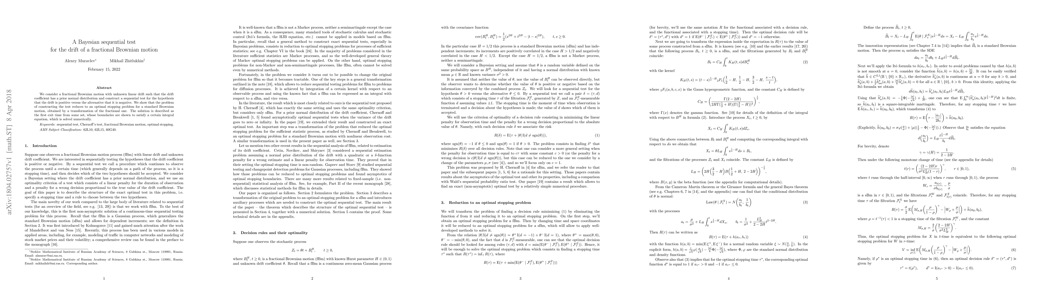 This paper develops a Bayesian sequential test for determining whether the drift of a fractional Brownian motion is positive or negative, reducing the problem to an optimal stopping problem for a transformed standard Brownian motion, with a solution involving the first exit time from a numerically determined boundary set.