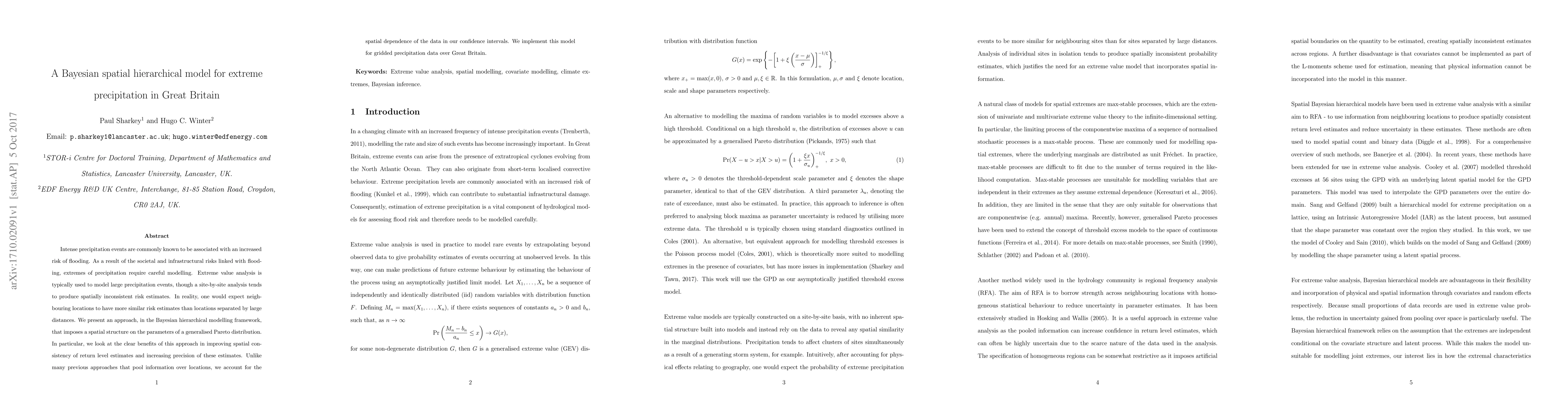 This paper proposes a Bayesian spatial hierarchical model to improve the consistency and precision of extreme precipitation estimates in Great Britain. By incorporating a spatial structure into the generalised Pareto distribution, the model provides more accurate and spatially consistent return level estimates compared to traditional site-by-site analyses.