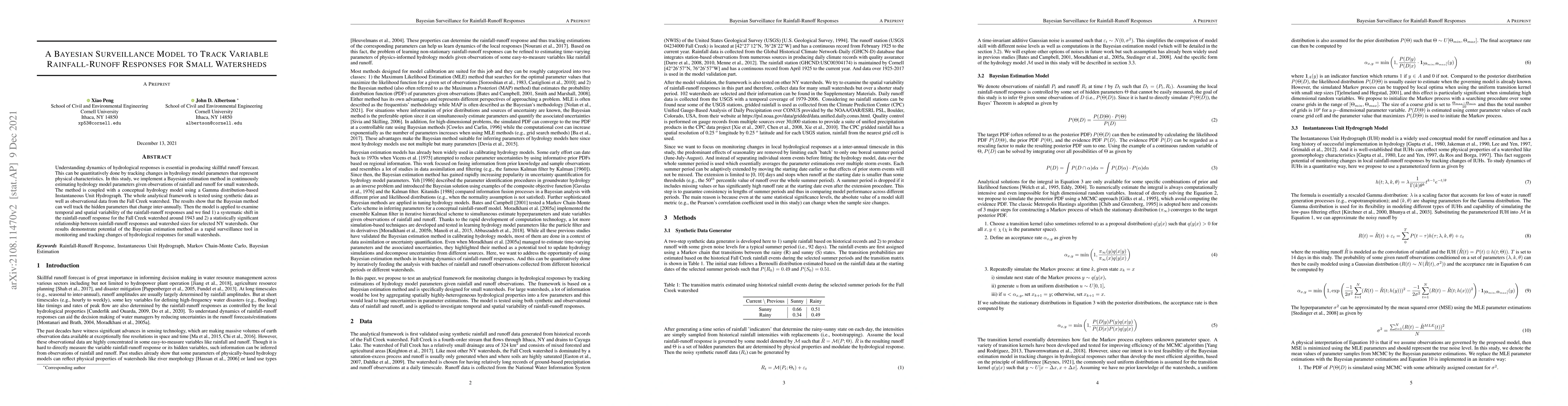 This paper proposes a Bayesian surveillance model to dynamically estimate hydrology parameters in small watersheds using rainfall and runoff observations. The model reveals significant temporal shifts in rainfall-runoff responses and a relationship between watershed size and response, highlighting the method's utility for monitoring hydrological changes.
