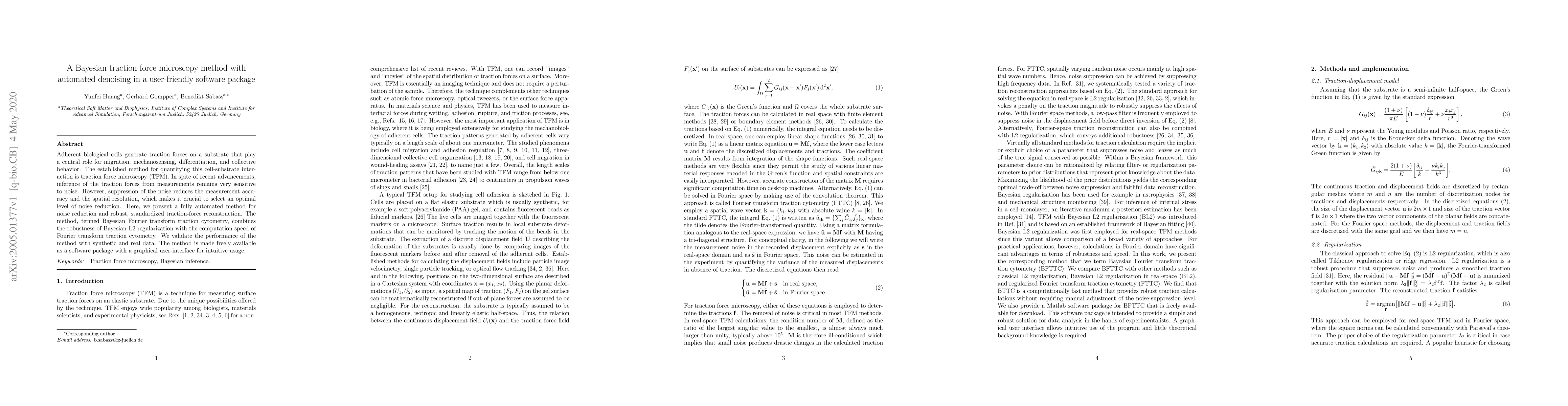 This paper introduces a Bayesian Fourier transform traction cytometry method for automated denoising in traction force microscopy, combining Bayesian regularization and Fourier transform for accurate, noise-reduced traction force reconstruction. The method is validated with both synthetic and real data and is provided as a user-friendly software package.