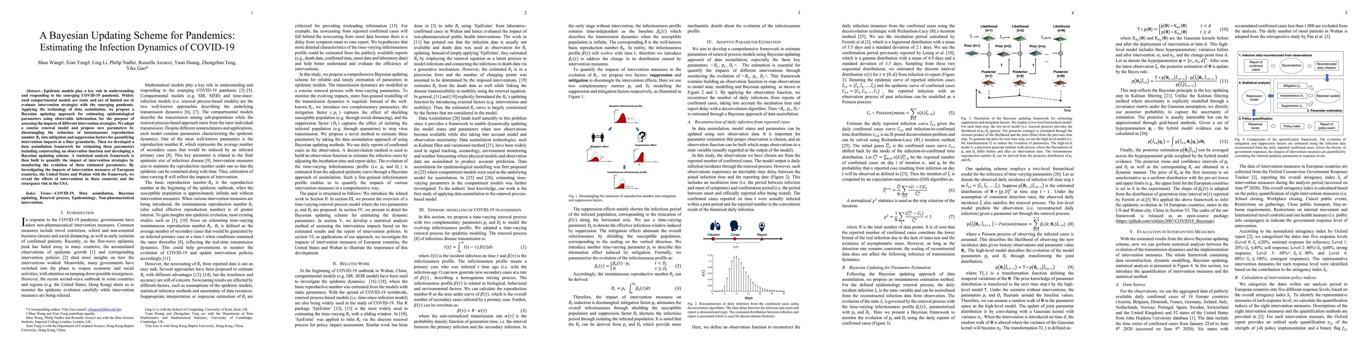 Epidemic models play a key role in understanding and responding to the emerging COVID-19 pandemic. Widely used compartmental models are static and are of limited use to evaluate intervention strategies with the emerging pandemic. Applying the technology of data assimilation, we propose a Bayesian updating approach for estimating epidemiological parameters using observable information for the purpose of assessing the impacts of different intervention strategies. We adopt a concise renewal model and propose new parameters by disentangling the reduction of instantaneous reproduction number Rt into mitigation and suppression factors for quantifying intervention impacts at a finer granularity. Then we developed a data assimilation framework for estimating these parameters including constructing an observation function and developing a Bayesian updating scheme. A statistical analysis framework is then built to quantify the impact of intervention strategies by monitoring the evolution of these estimated parameters. By Investigating the impacts of intervention measures of European countries, the United States and Wuhan with the framework, we reveal the effects of interventions in these countries and the resurgence risk in the USA.