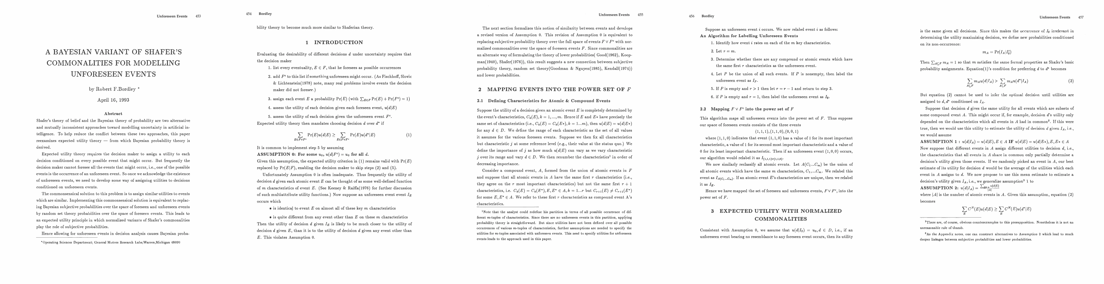 Shafer's theory of belief and the Bayesian theory of probability are two alternative and mutually inconsistent approaches toward modelling uncertainty in artificial intelligence. To help reduce the conflict between these two approaches, this paper reexamines expected utility theory-from which Bayesian probability theory is derived. Expected utility theory requires the decision maker to assign a utility to each decision conditioned on every possible event that might occur. But frequently the decision maker cannot foresee all the events that might occur, i.e., one of the possible events is the occurrence of an unforeseen event. So once we acknowledge the existence of unforeseen events, we need to develop some way of assigning utilities to decisions conditioned on unforeseen events. The commonsensical solution to this problem is to assign similar utilities to events which are similar. Implementing this commonsensical solution is equivalent to replacing Bayesian subjective probabilities over the space of foreseen and unforeseen events by random set theory probabilities over the space of foreseen events. This leads to an expected utility principle in which normalized variants of Shafer's commonalities play the role of subjective probabilities. Hence allowing for unforeseen events in decision analysis causes Bayesian probability theory to become much more similar to Shaferian theory.