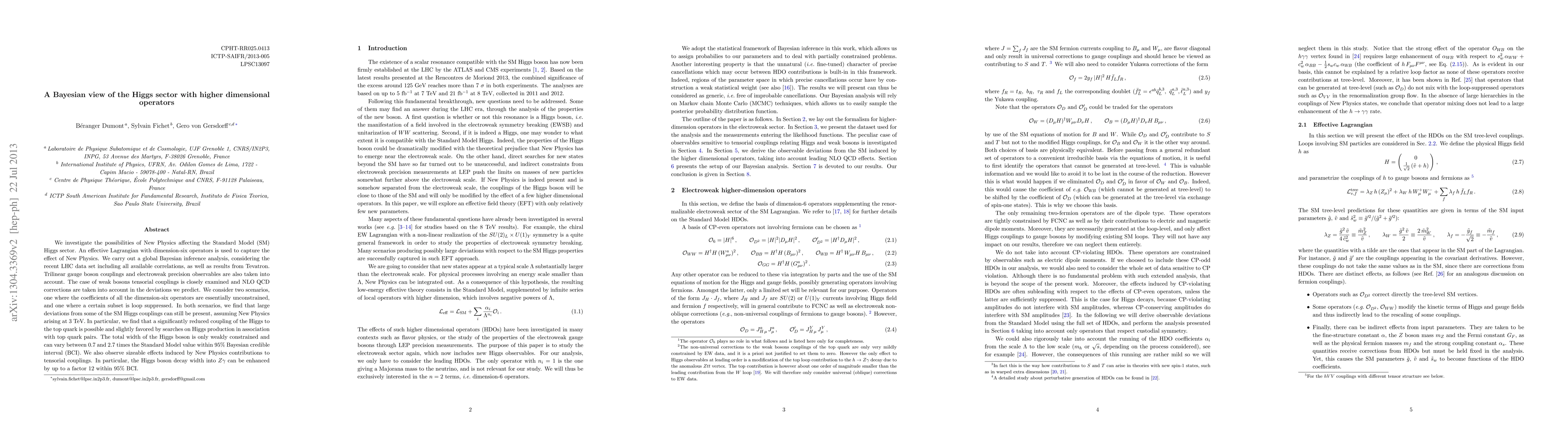 This paper uses Bayesian analysis to explore how New Physics might affect the Standard Model Higgs sector through higher-dimensional operators. It finds significant deviations from Standard Model predictions, especially in the Higgs-top quark coupling and the Higgs boson decay width, with the latter potentially increasing by up to a factor of 12.