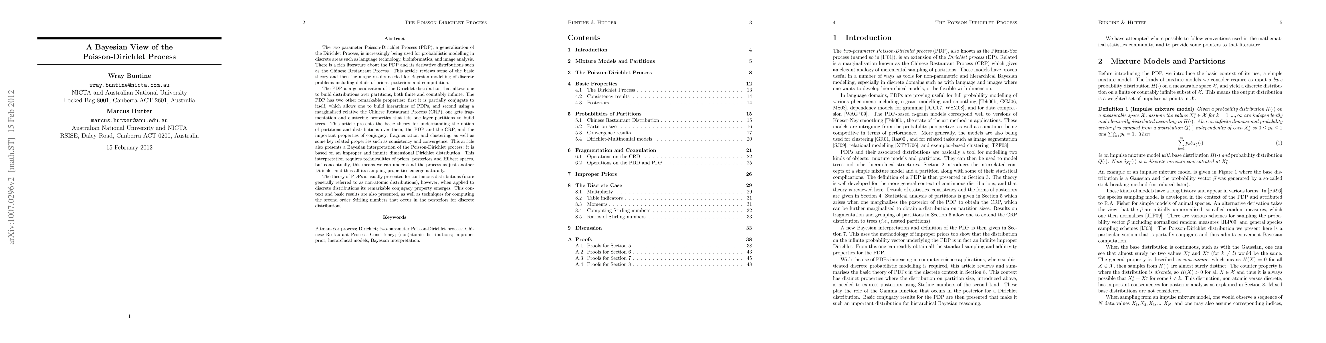 This paper reviews the Poisson-Dirichlet Process (PDP), a generalization of the Dirichlet Process, for Bayesian modeling in discrete areas like language technology and bioinformatics. It presents key theory, properties, and computation methods for PDPs, highlighting its conjugacy, fragmentation, and clustering features.