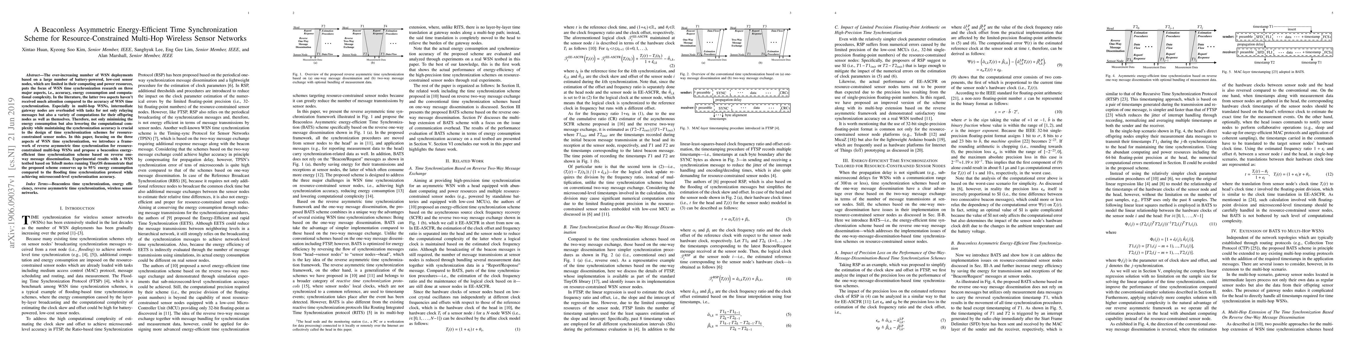 This paper introduces a beaconless, asymmetric energy-efficient time synchronization scheme for resource-constrained multi-hop wireless sensor networks (WSNs), emphasizing minimizing energy consumption and computational complexity while maintaining synchronization accuracy. Experimental results show significant energy savings and microsecond-level synchronization accuracy.