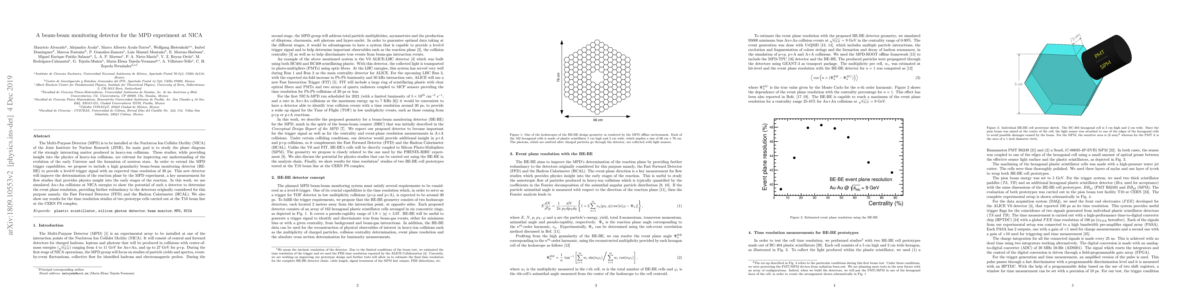 The Multi-Purpose Detector (MPD) is to be installed at the Nuclotron Ion Collider fAcility (NICA) of the Joint Institute for Nuclear Research (JINR). Its main goal is to study the phase diagram of the strongly interacting matter produced in heavy-ion collisions. These studies, while providing insight into the physics of heavy-ion collisions, are relevant for improving our understanding of the evolution of the early Universe and the formation of neutron stars. In order to extend the MPD trigger capabilities, we propose to include a high granularity beam-beam monitoring detector (BE-BE) to provide a level-0 trigger signal with an expected time resolution of 30 ps. This new detector will improve the determination of the reaction plane by the MPD experiment, a key measurement for flow studies that provides physics insight into the early stages of the reaction. In this work, we use simulated Au+Au collisions at NICA energies to show the potential of such a detector to determine the event plane resolution, providing further redundancy to the detectors originally considered for this purpose namely, the Fast Forward Detector (FFD) and the Hadron Calorimeter (HCAL). We also show our results for the time resolution studies of two prototype cells carried out at the T10 beam line at the CERN PS complex.
