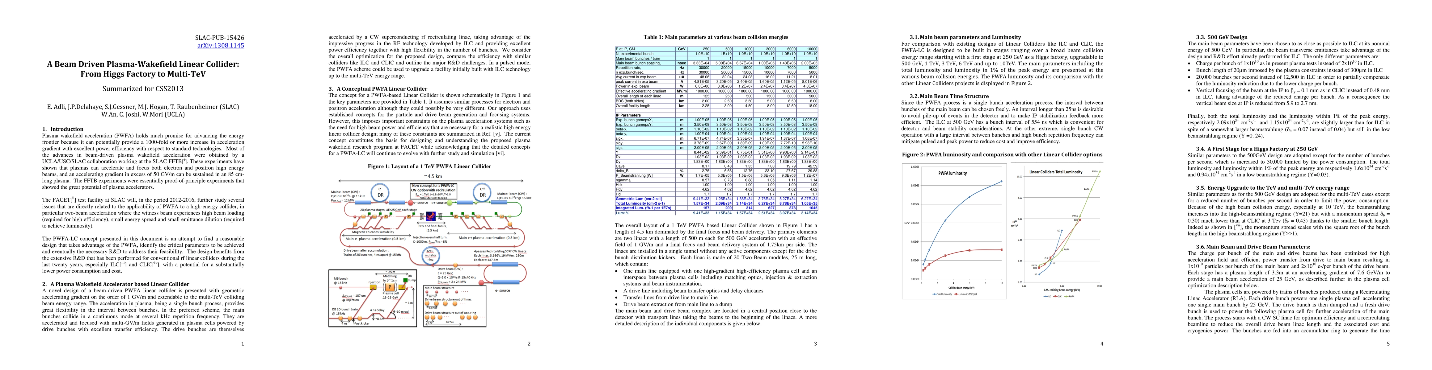 This research is significant as it explores a novel technology (PWFA) with large accelerating fields and excellent power efficiency, applicable for various high-energy physics applications from Higgs factories to Multi-TeV collisions.